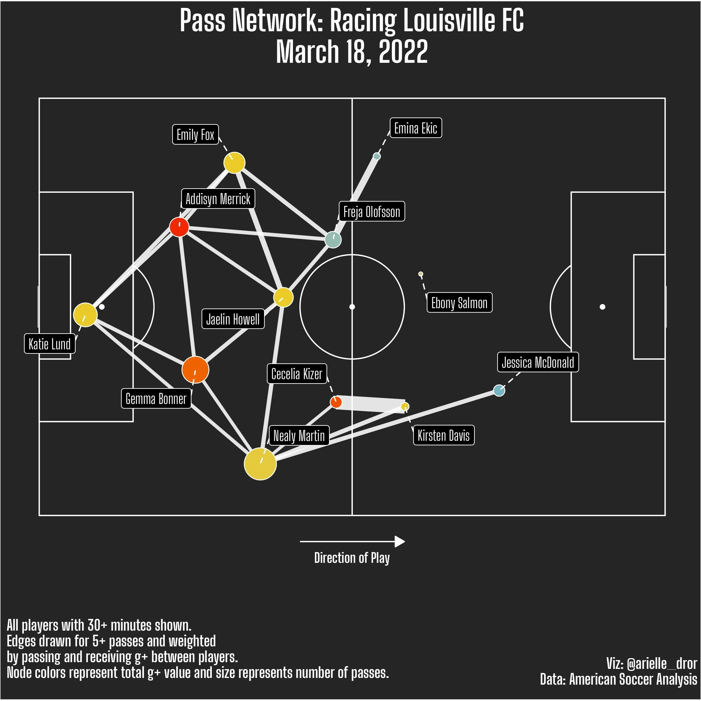 Since this match was the debut for both Jae Howell and Kirsten Davis, let’s start there. I fully expect Howell to be a great player for Racing, but last night’s match was probably her first non-international match in a very long time where she wasn’t the best player on the pitch. To be honest (and I know I am in the minority here), I think Jae would have been better served with an extra 2 weeks in Racing’s camp over the USWNT call up that took her away. Fox was called up too but is more experienced and her time away probably didn’t hurt her at all in her preparation for the season. In the first half, Howell looked a little tentative at times, and surprisingly to me at least…off the pace. More than once, an attacking player went by her fairly easily. Her passing was a bit off as well with a 66% pass completion rate. That looks especially poor when compared to an expected pass completion of 77% based on American Soccer Analysis xPass model. However, she turned things around in the second half and looked much more settled. I would classify her performance as a learning experience. I am 100% positive that the next match will better showcase her skills.