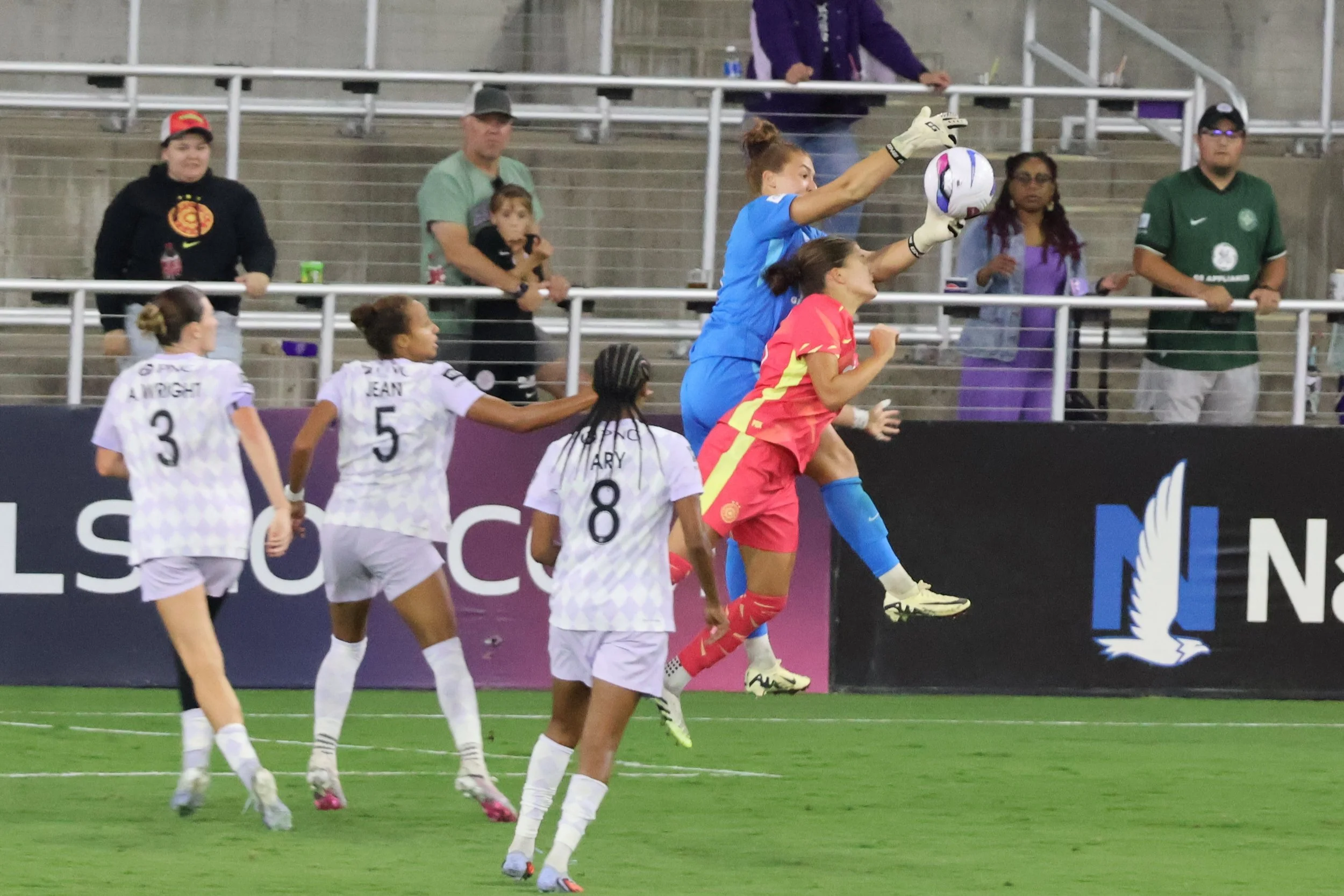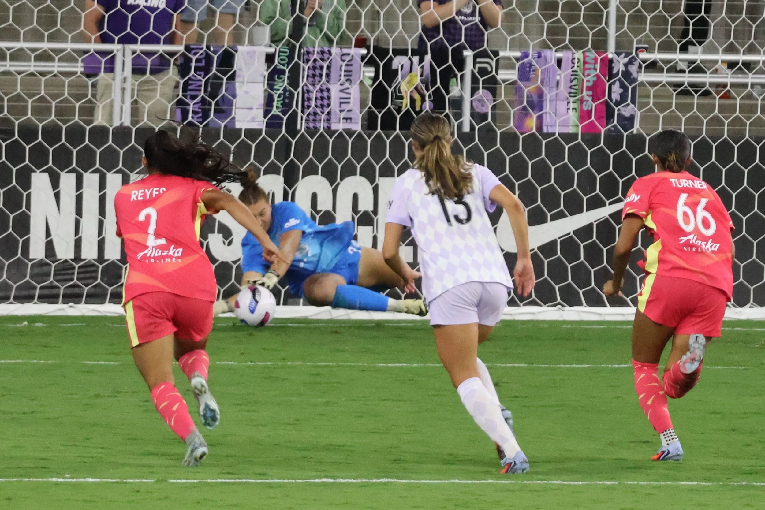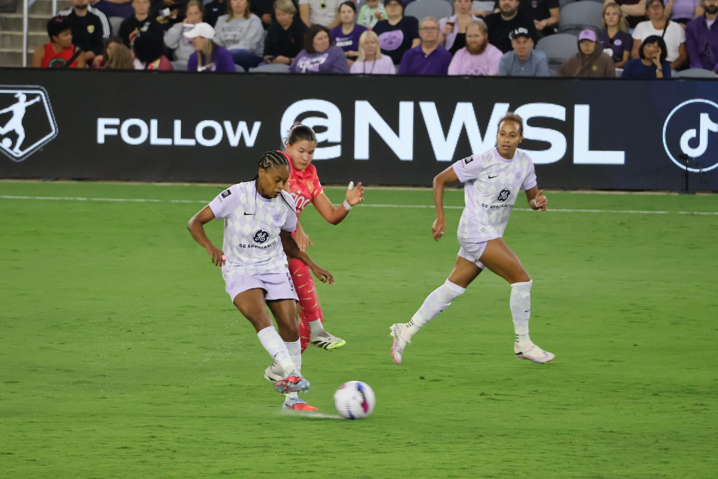 Savannah DeMelo uses her fancy footwork to taunt the Thorns early in the match.