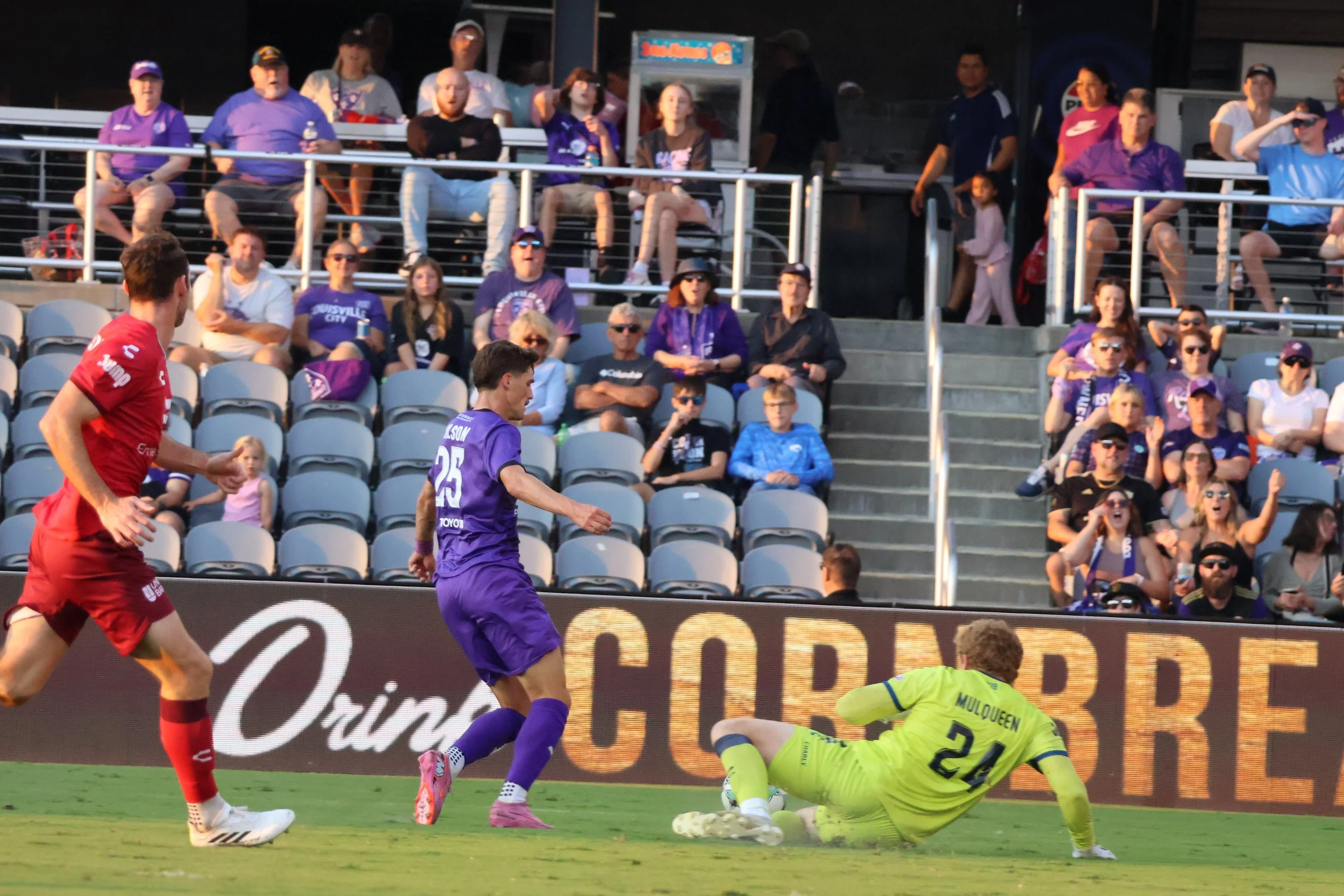 Kyle Adams offers a high-five to a fearful NC player as Lou City sets up an early goal opportunity.