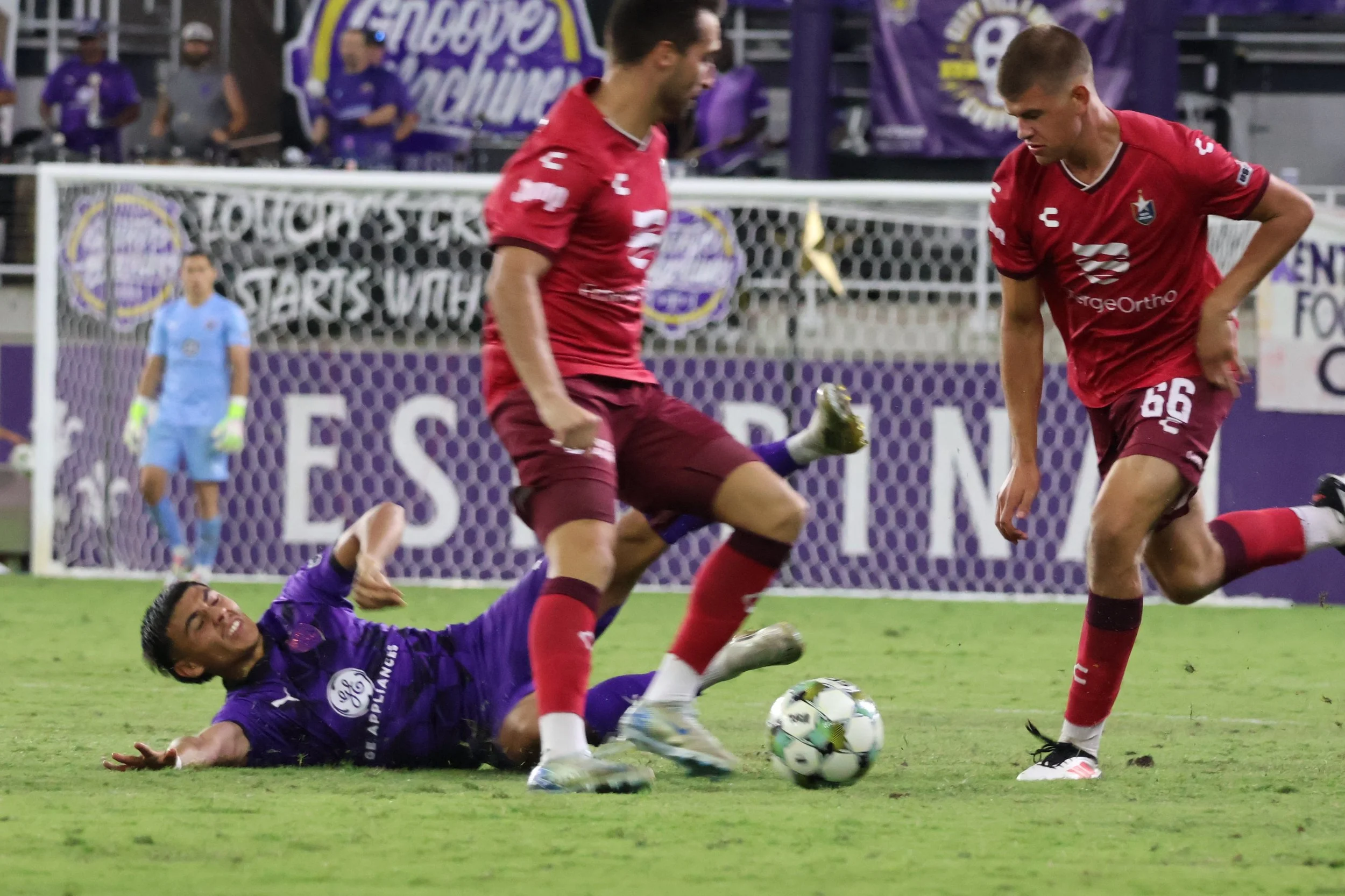 Lancaster, the ball, and a crying Keeper have a tea party in the net after Evan Davila’s first regular-season USL goal.