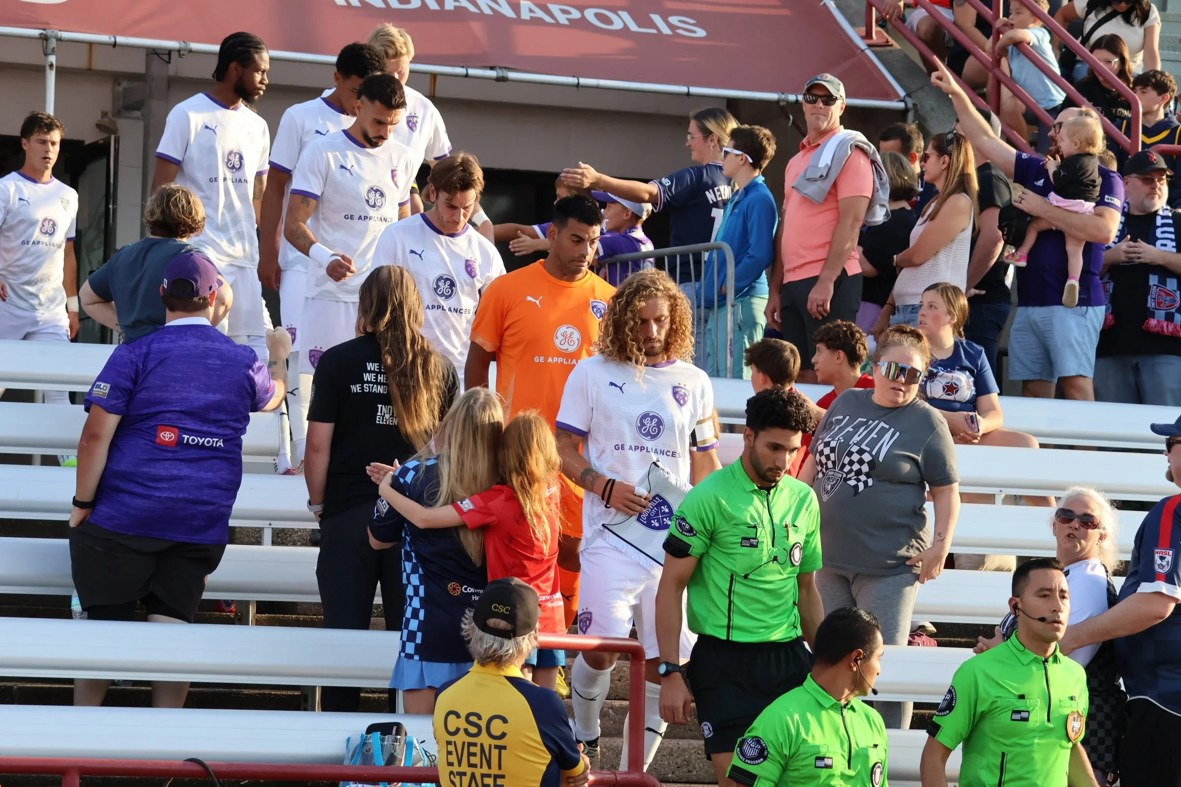 The Player Walk-Out was down bleacher stairs, across a running track, and through the woods to grandma’s house. In cleats. If someone had fallen and broken their leg, we would’ve been forced to put them down (like a horse), according to the wise words of the Indy fans in the supporters’ zone. And so it begins.