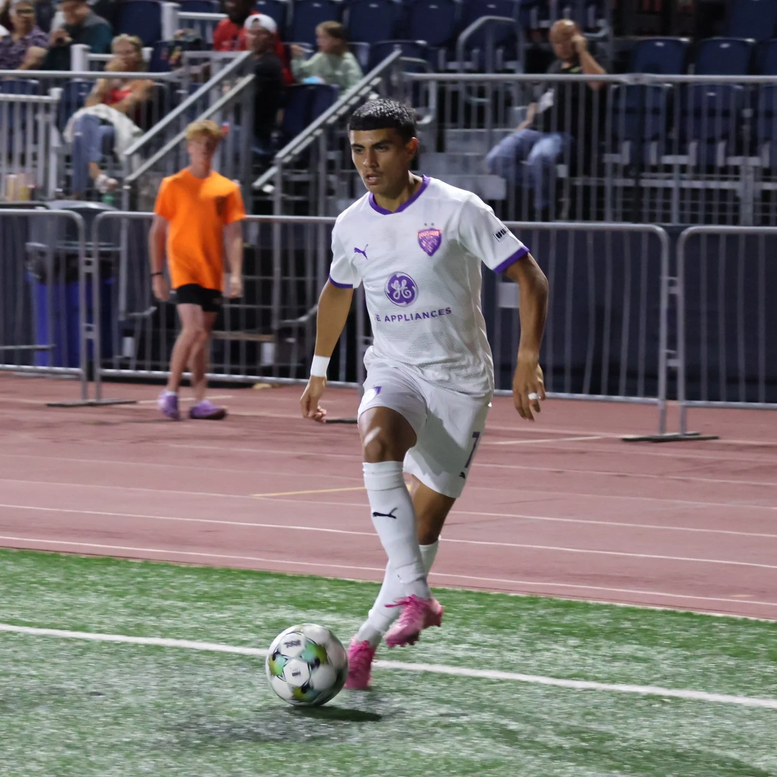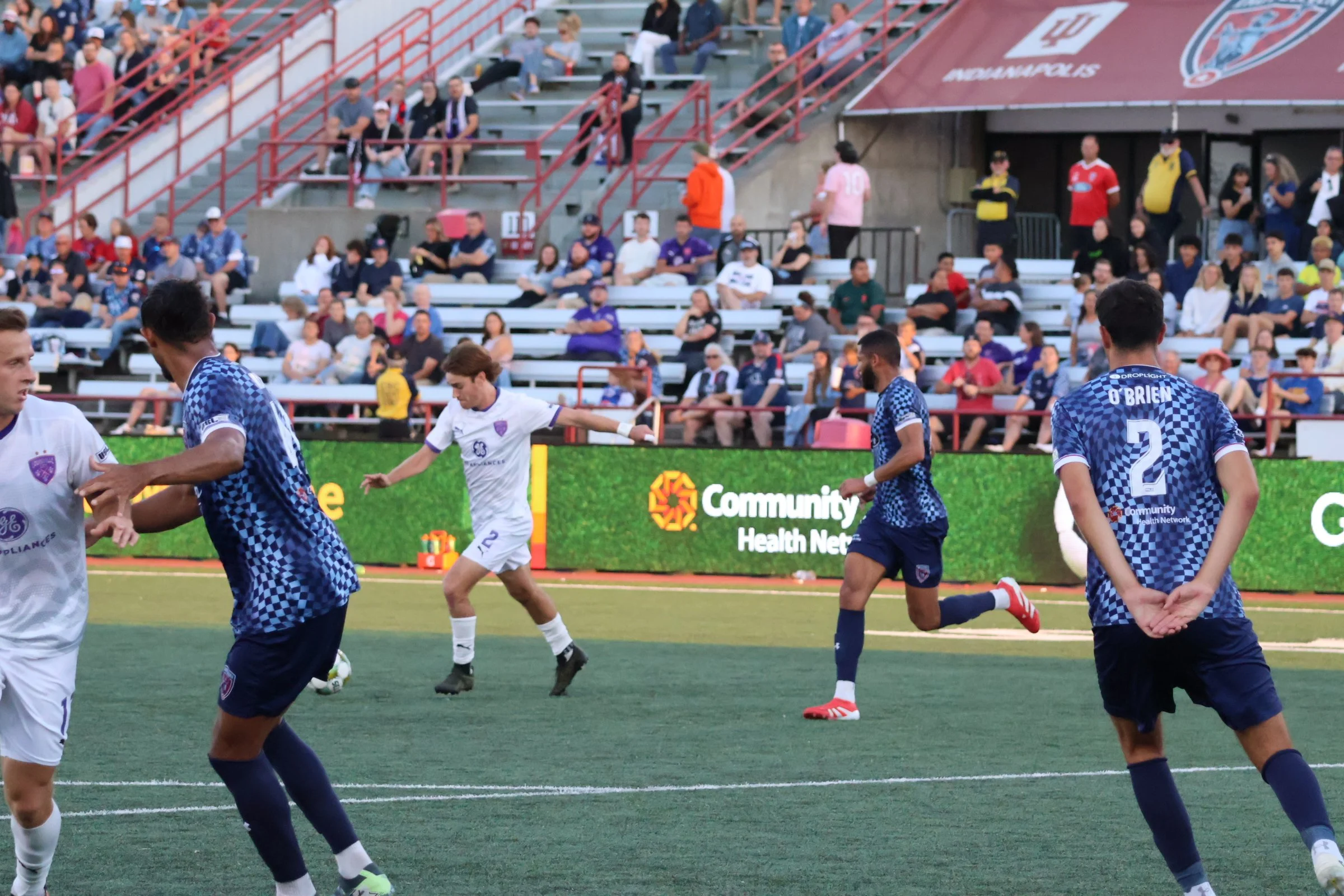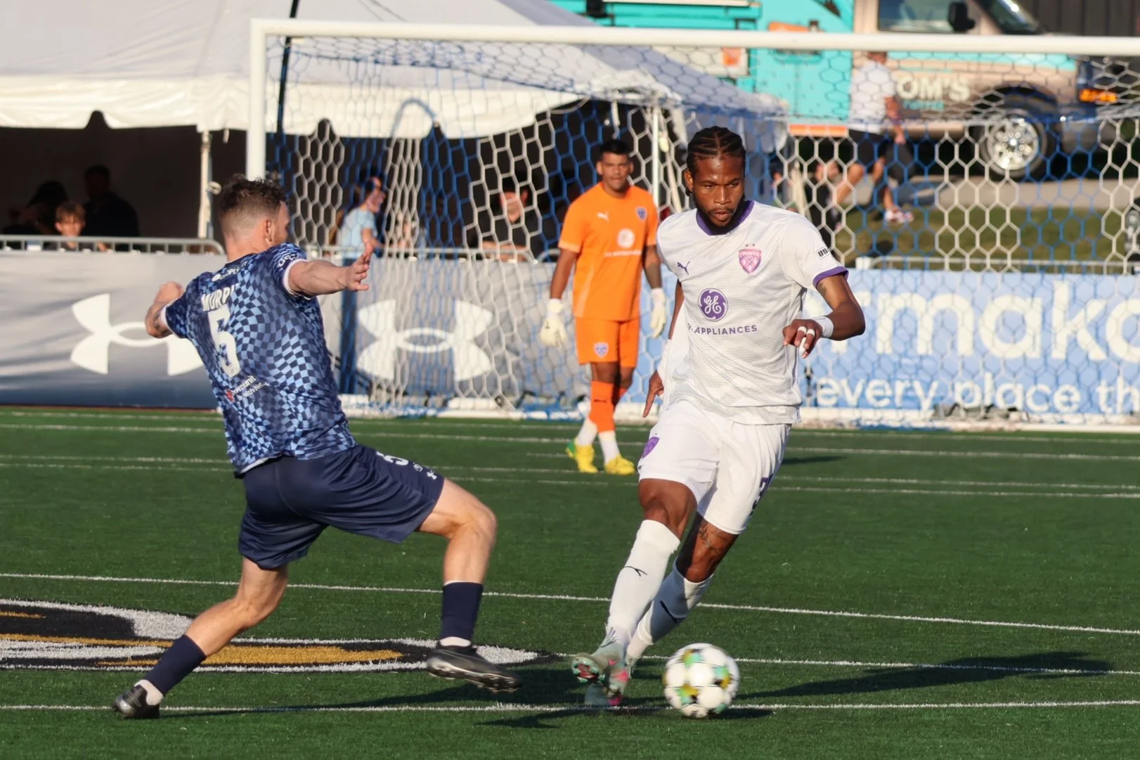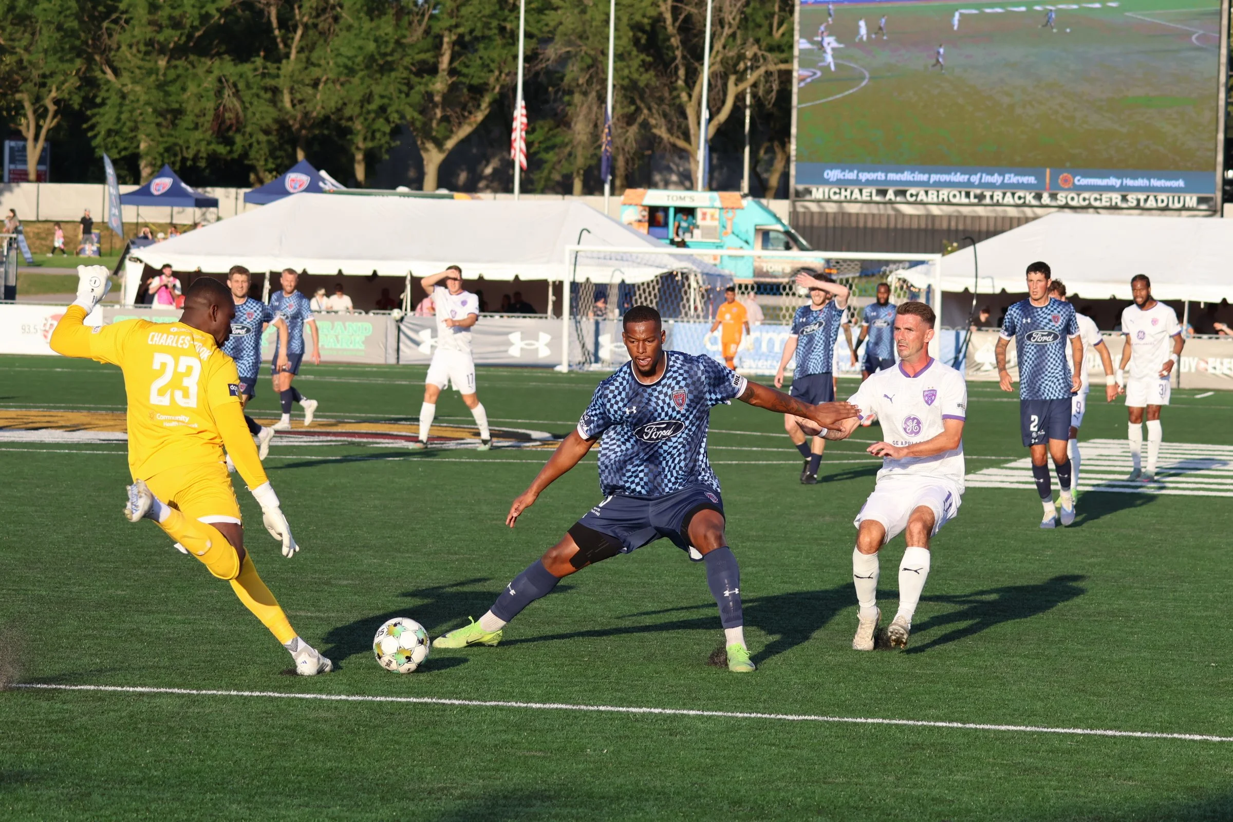 Kevon Lambert gracefully takes the ball down the pitch, ignoring the pleas from Indy for a high-five.