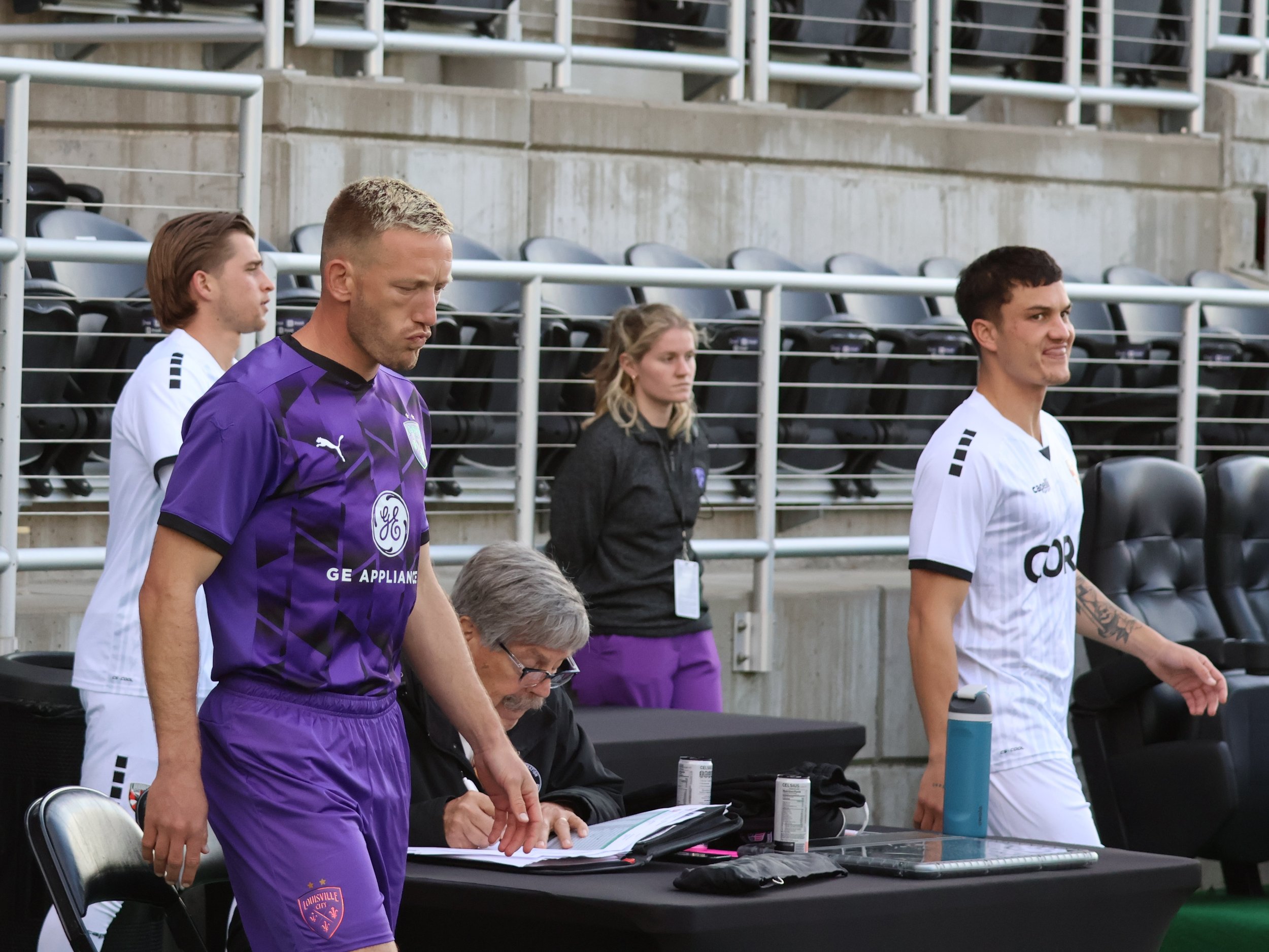 After the 2-1 victory, Adams visits his Racing Louisville FC fan club (left, Savannah DeMelo; right, Emma Sears). I thought he might be proposing to Sav, but I think he was just taking a rest on one of the comfy buckets behind the boards. Whew.