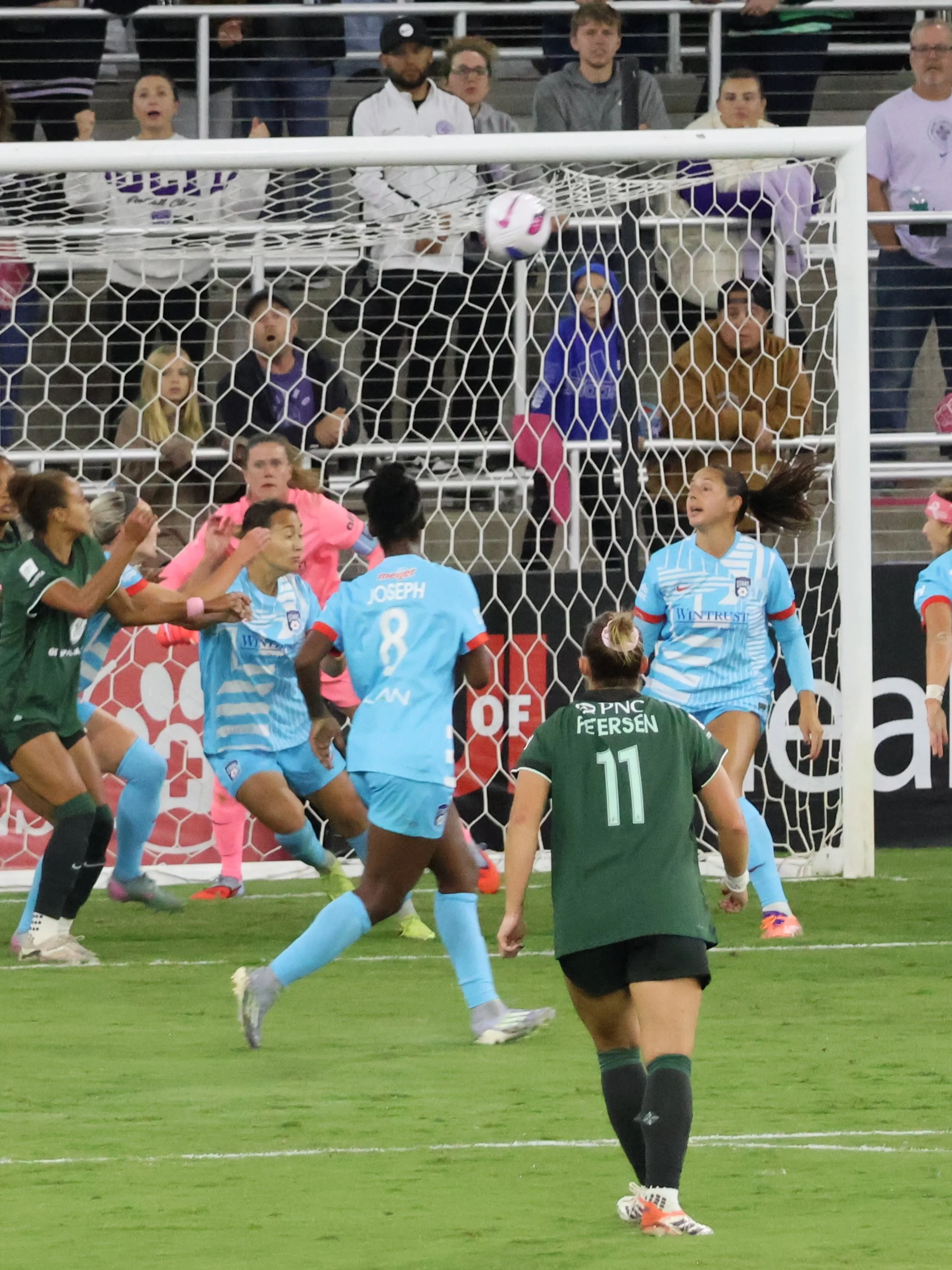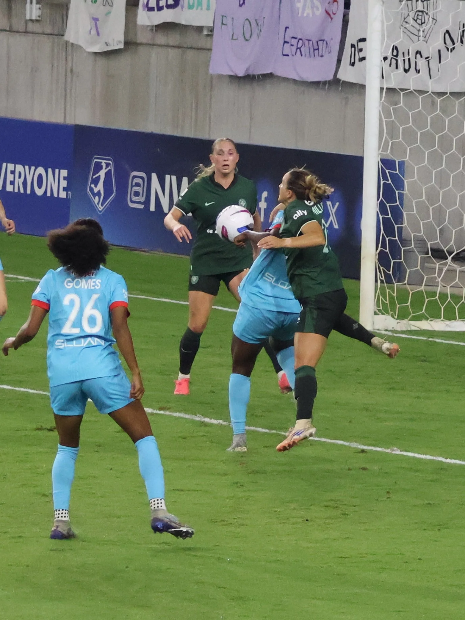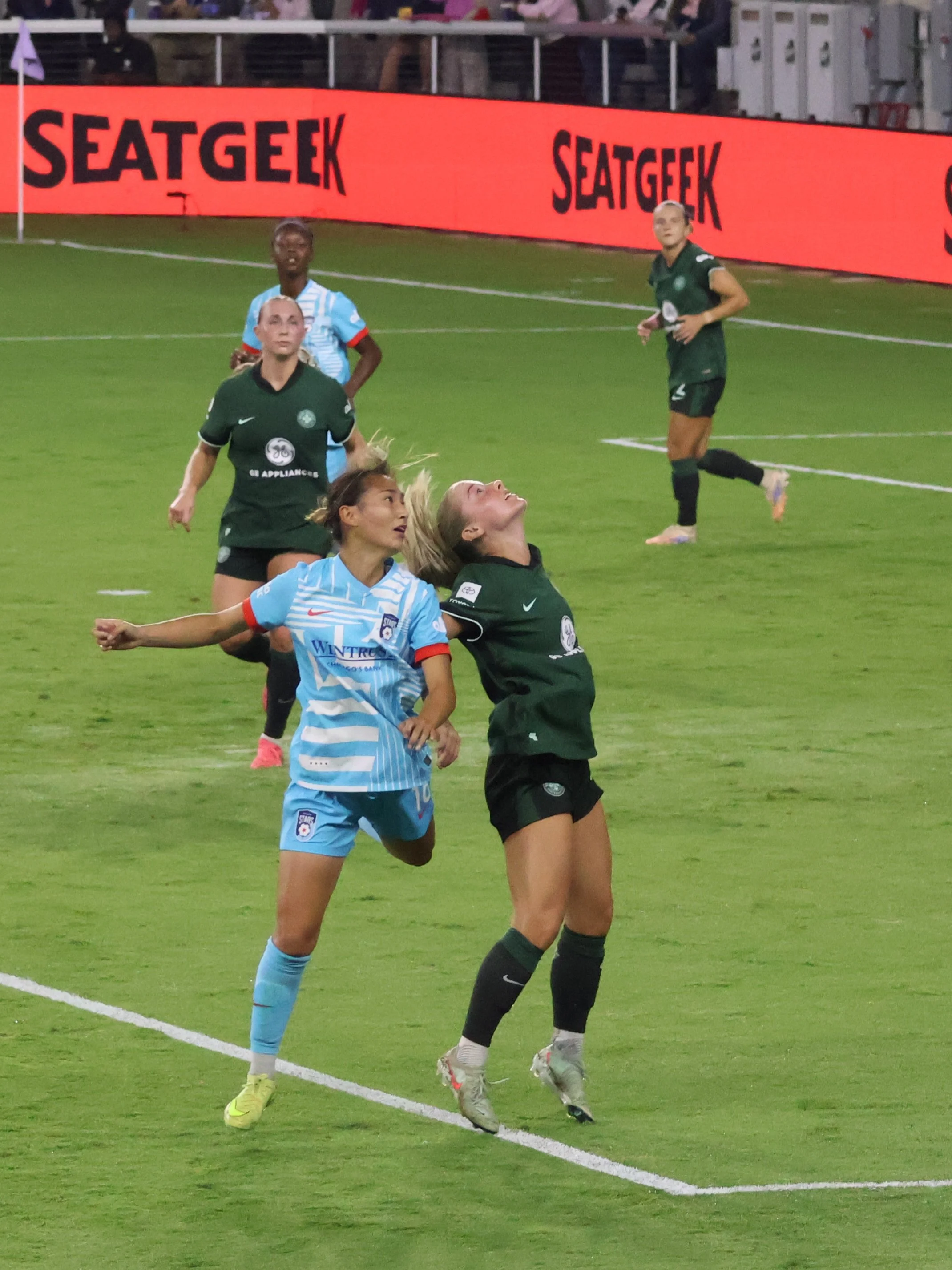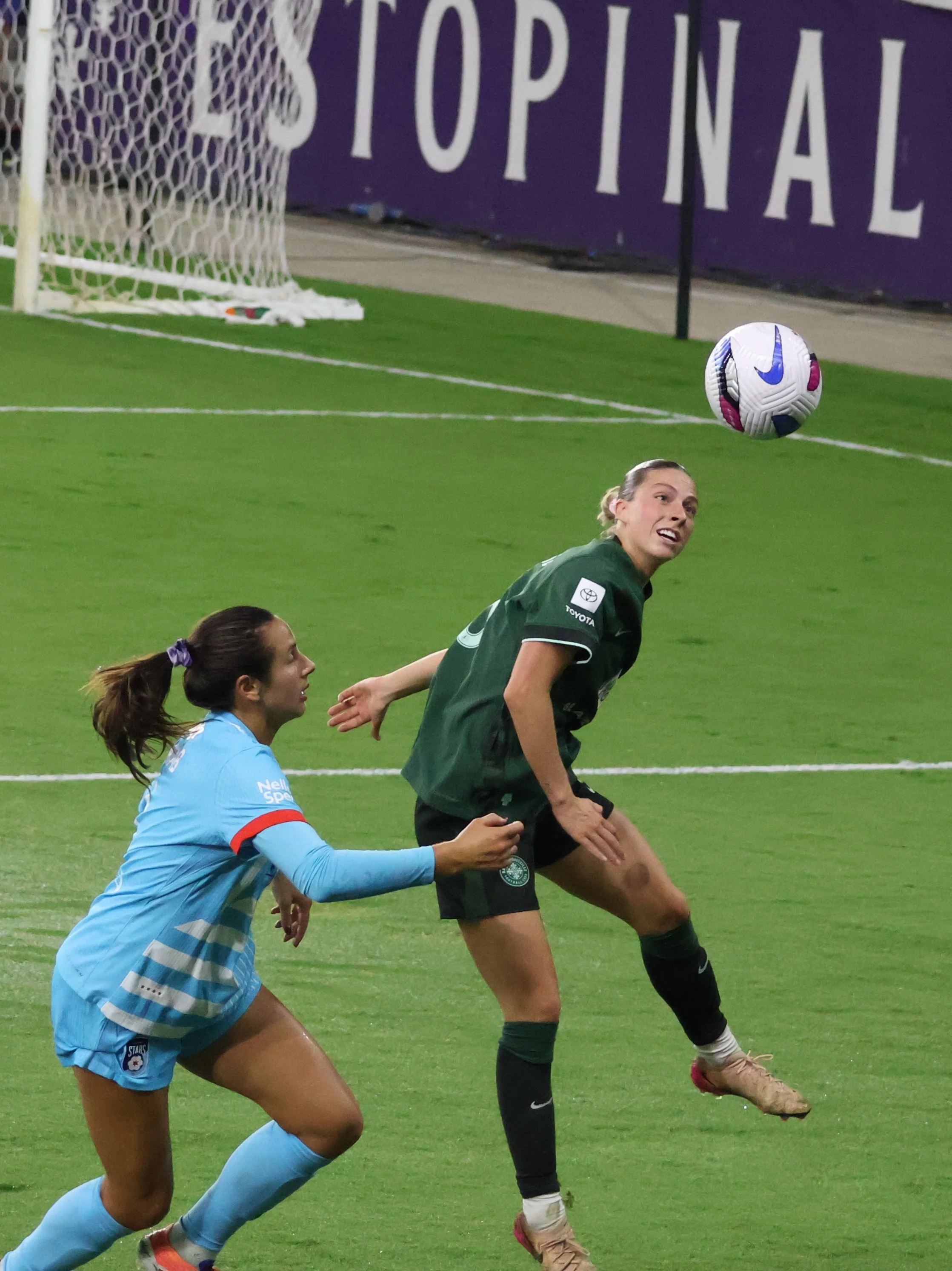 Ella Hase goes in for header, questioning the ball and her unwillingness to find the net tonight. (Of course the ball is a her. She’s stubborn and finicky and beautiful when she wants to be.)