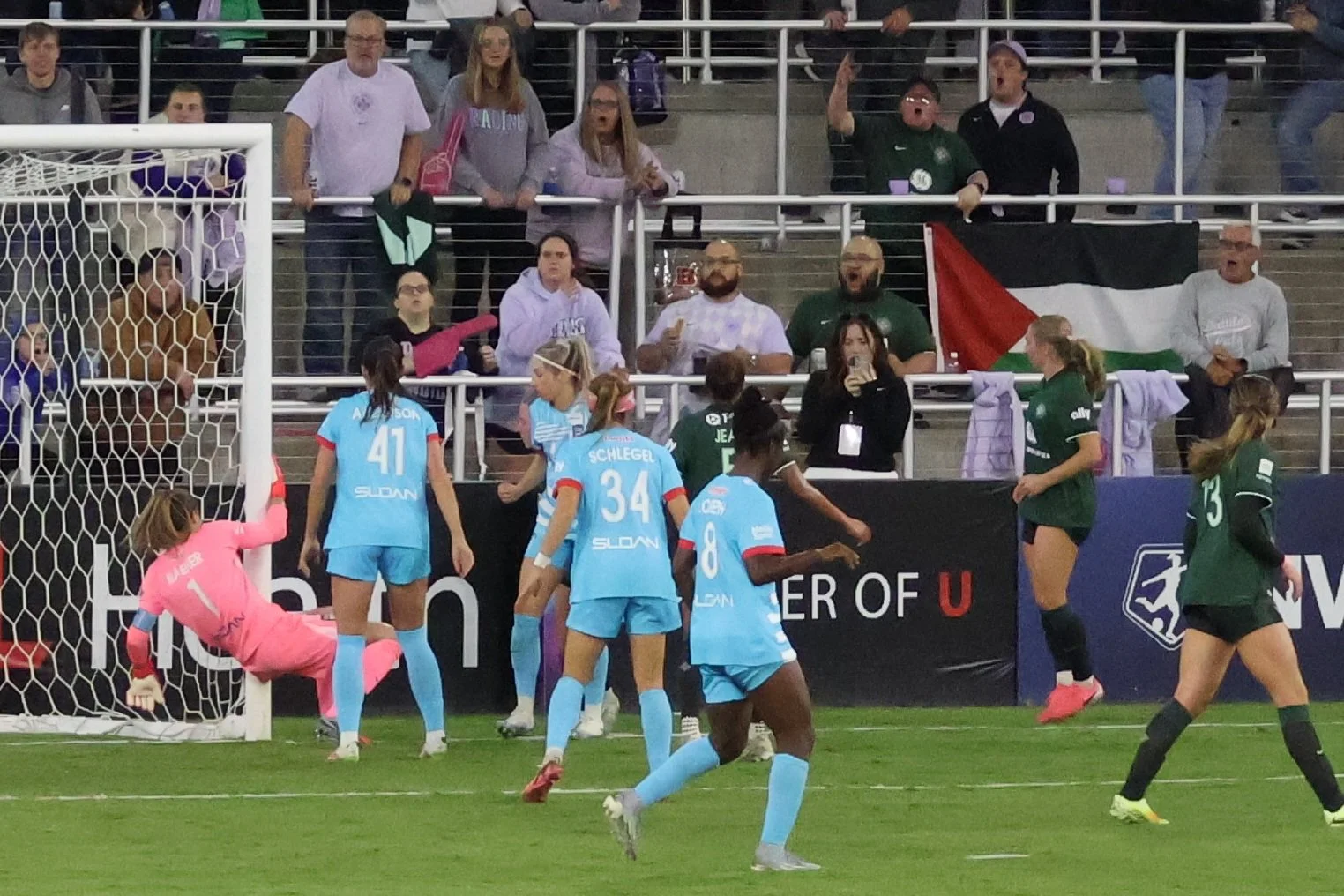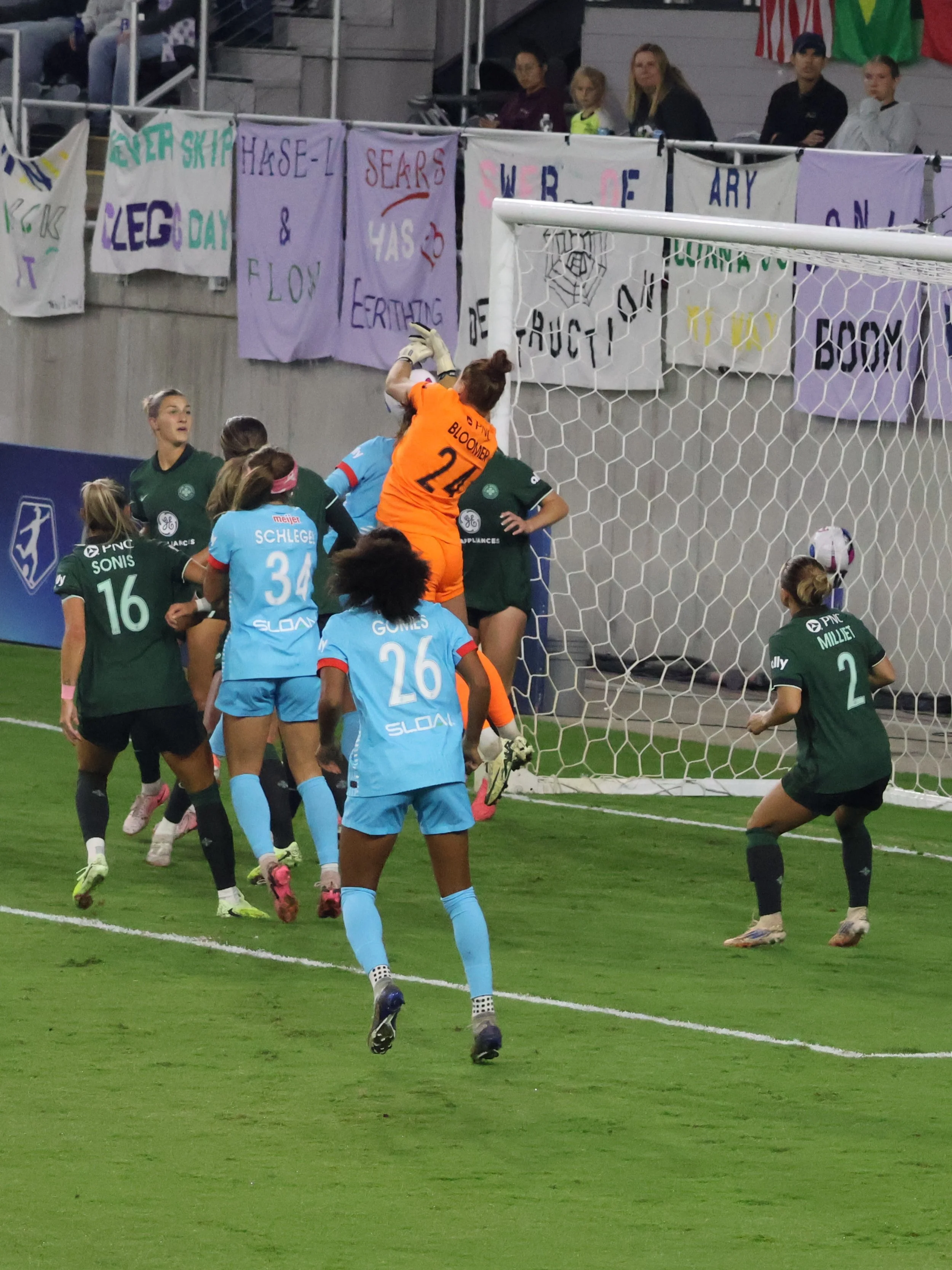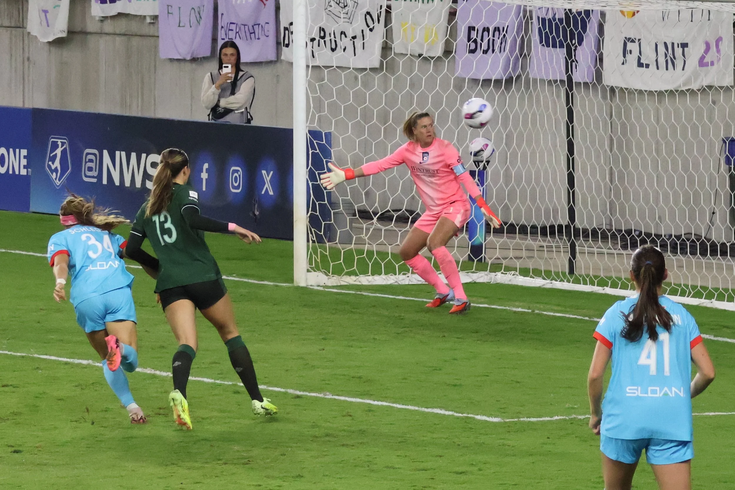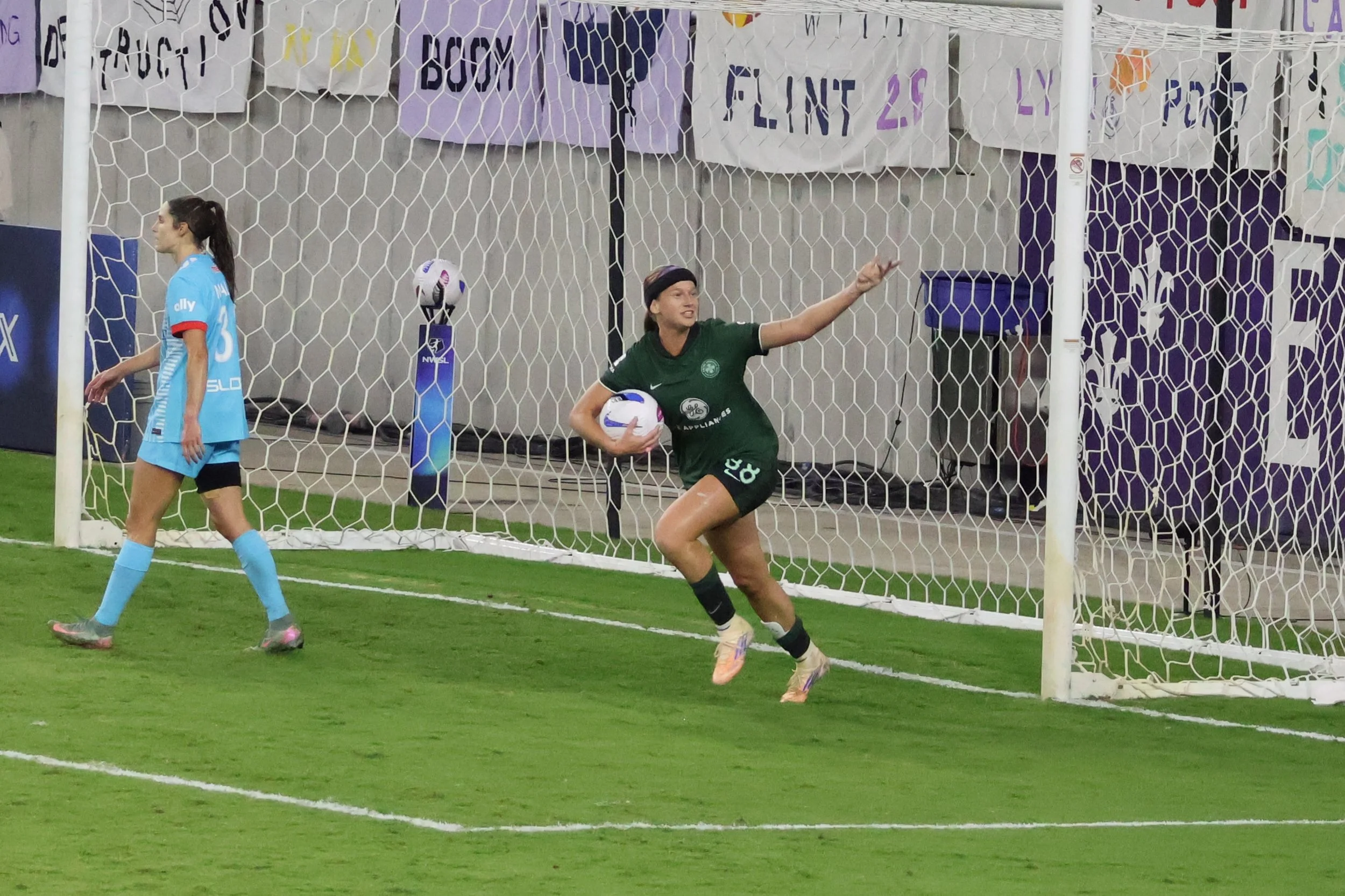 Naeher does chin-ups on the goal as she admires her save of another Racing attempt. They’re getting a little closer each time.