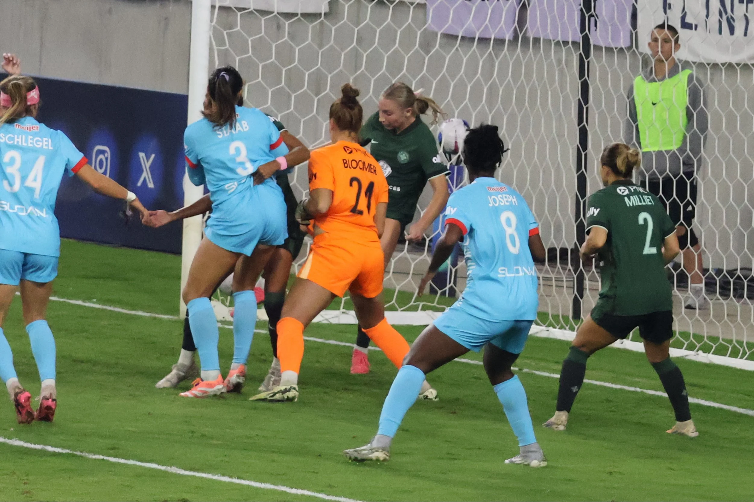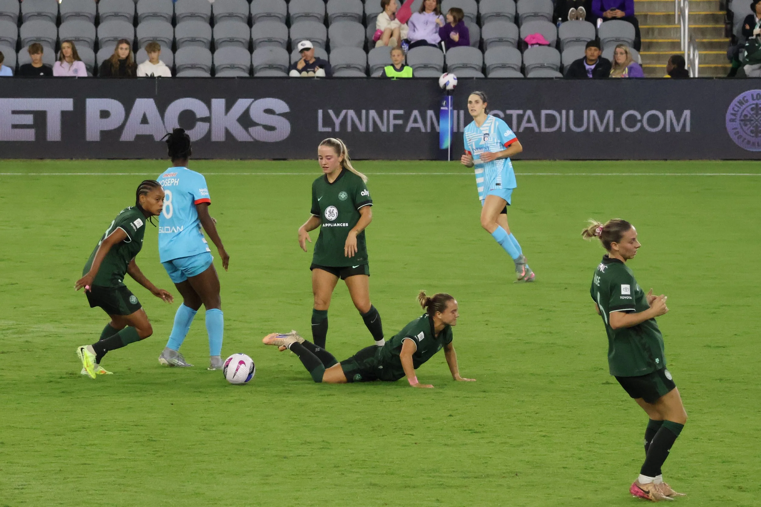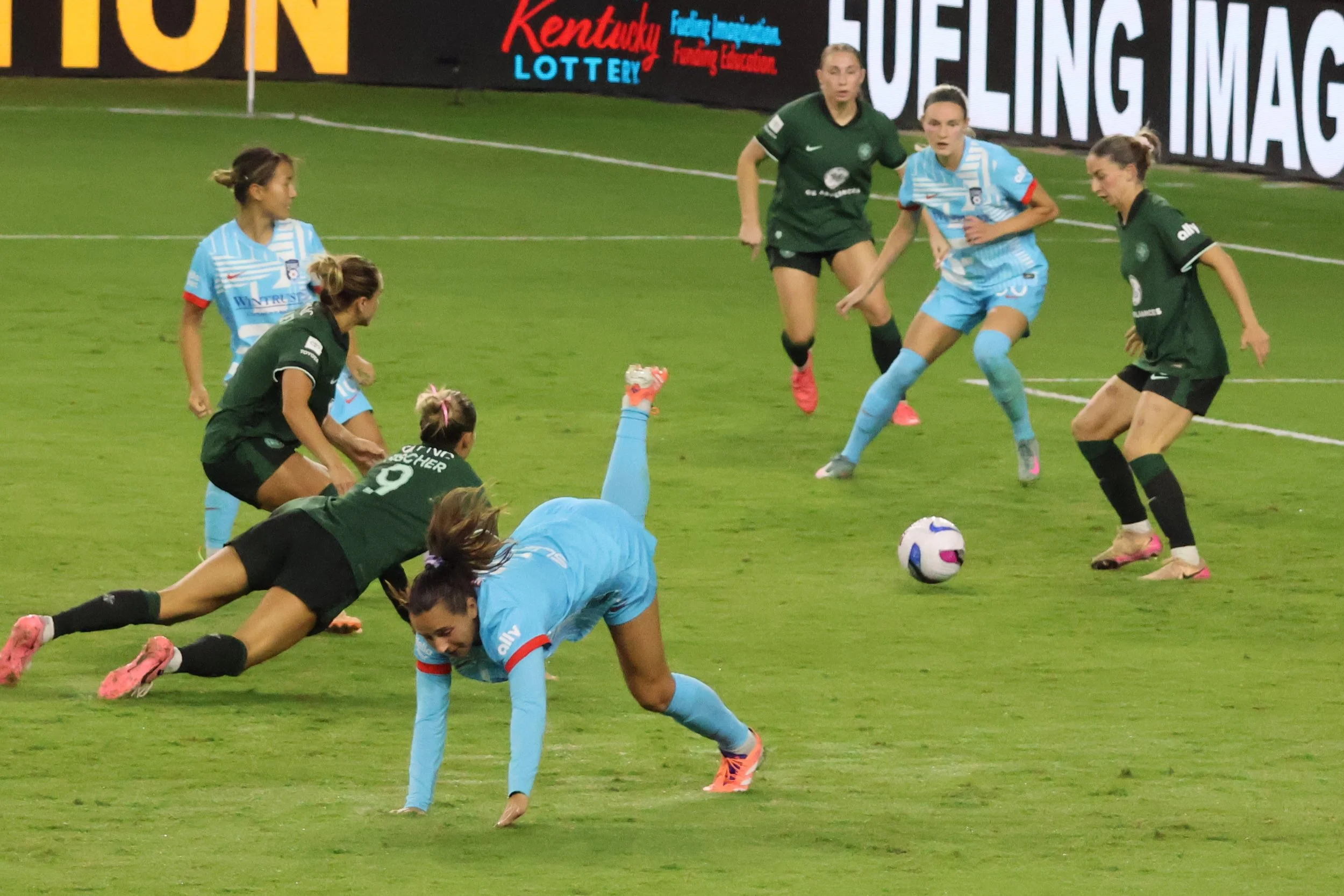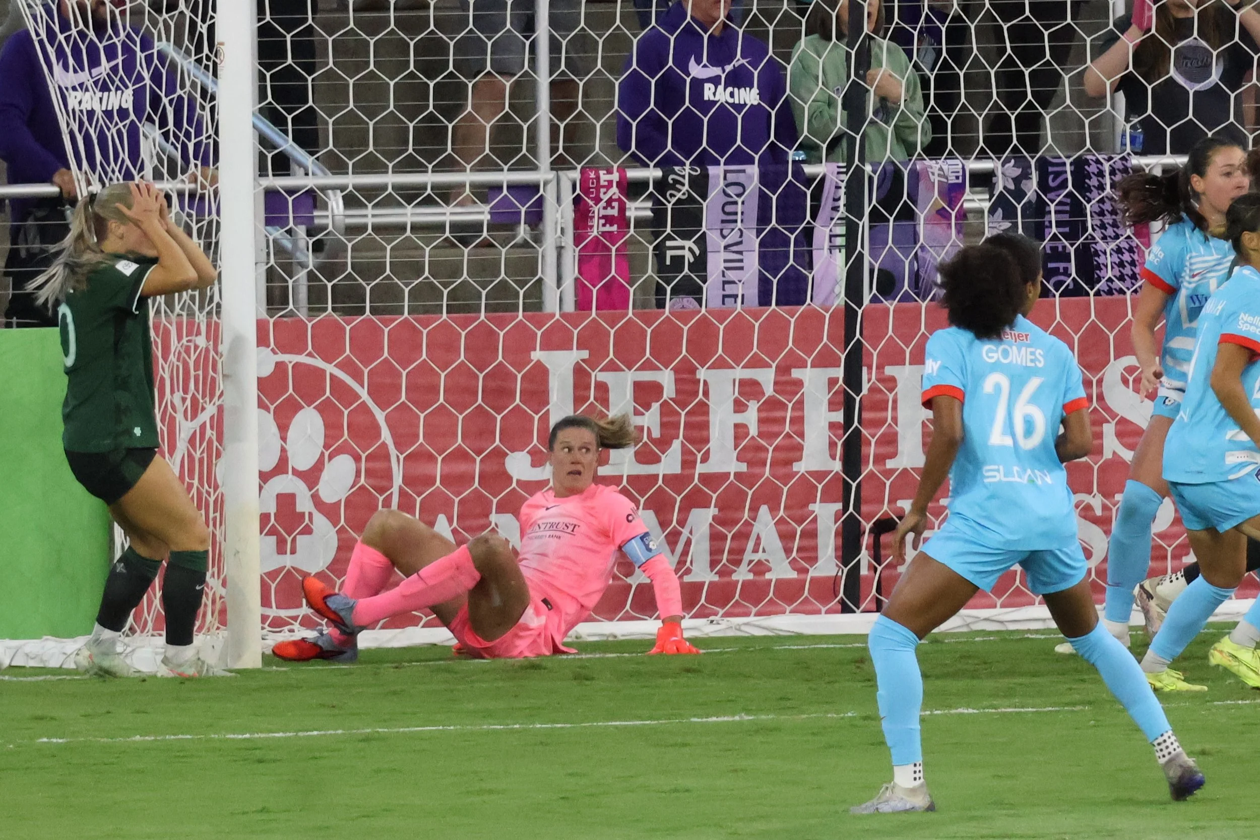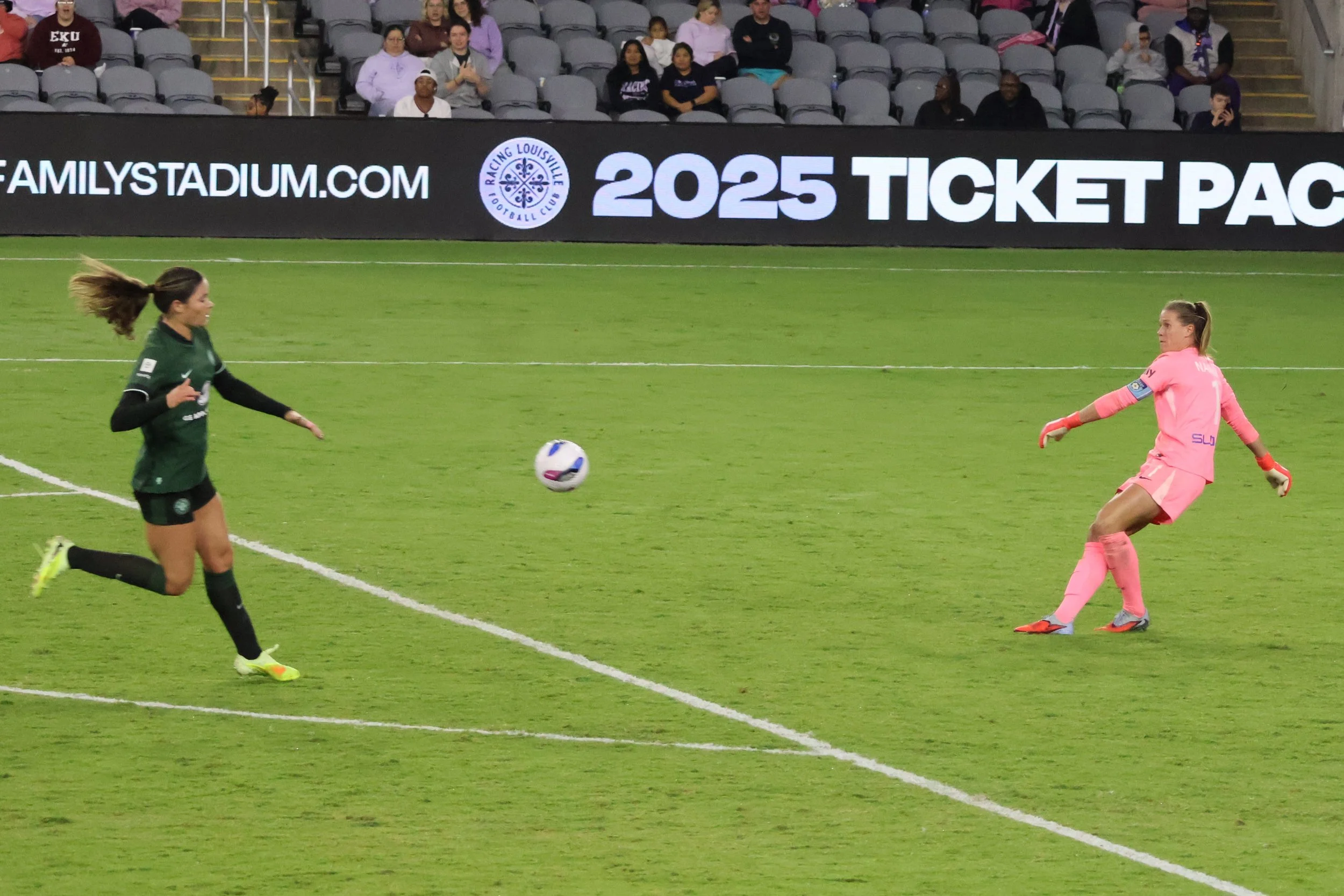 Katie O’Kane is in disbelief and US Women’s National team keeper is literally floored as well. The first of many beautiful opportunities that gave Racing fans hope throughout the match.
