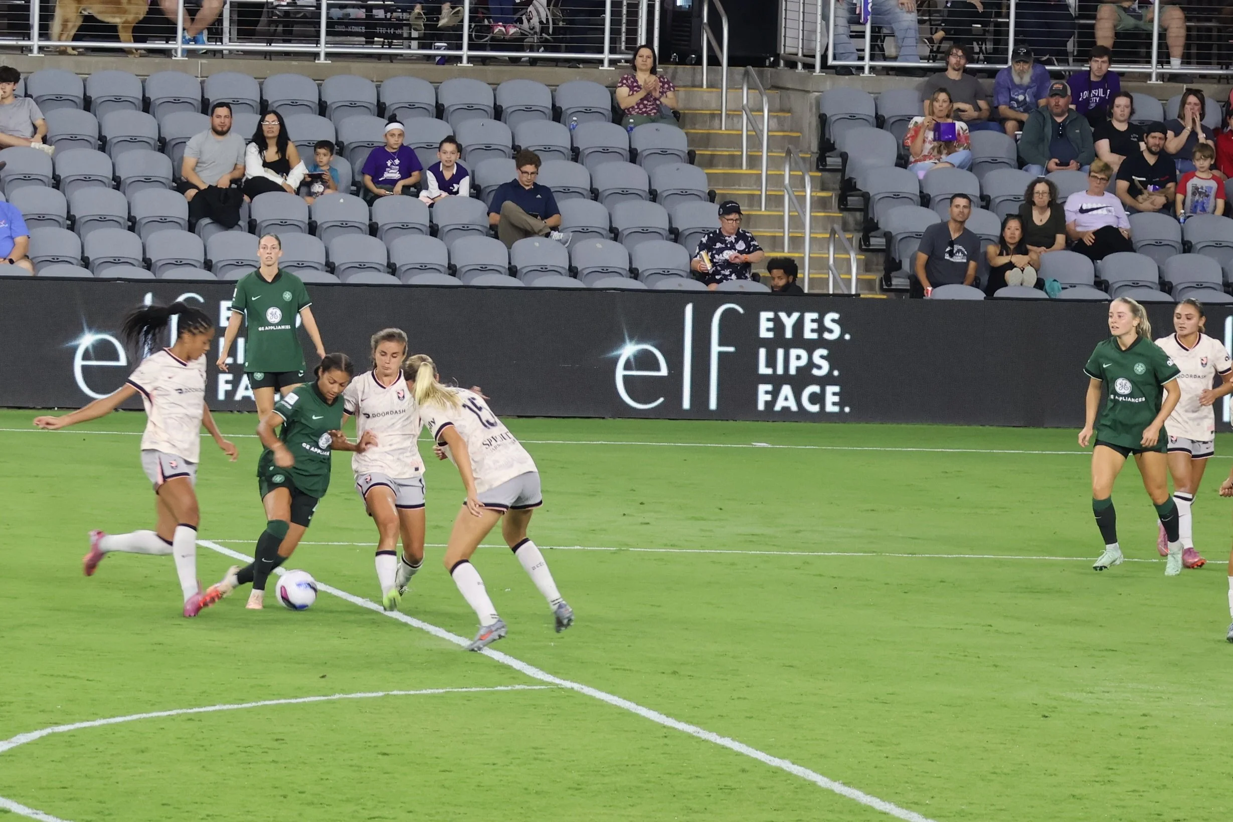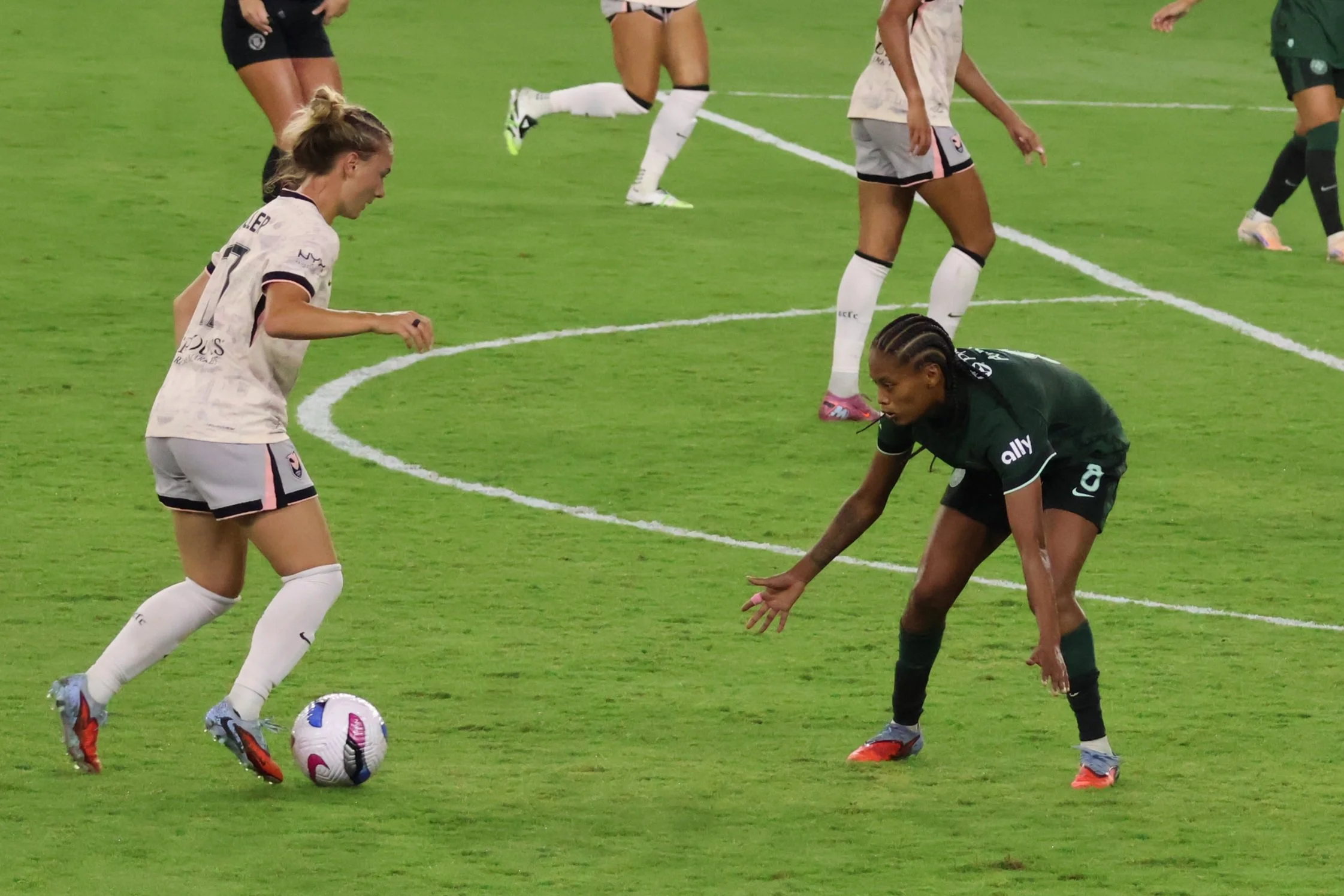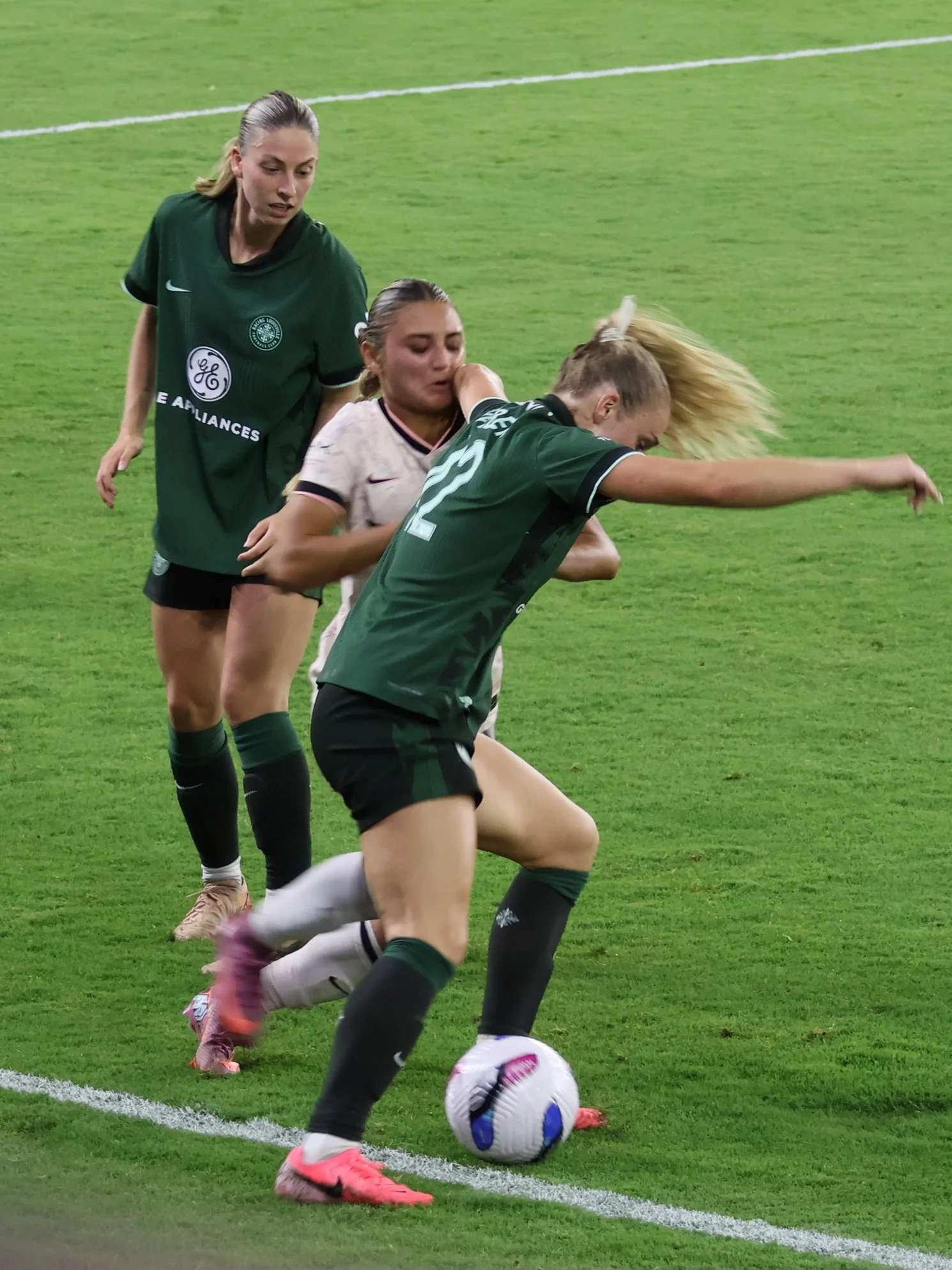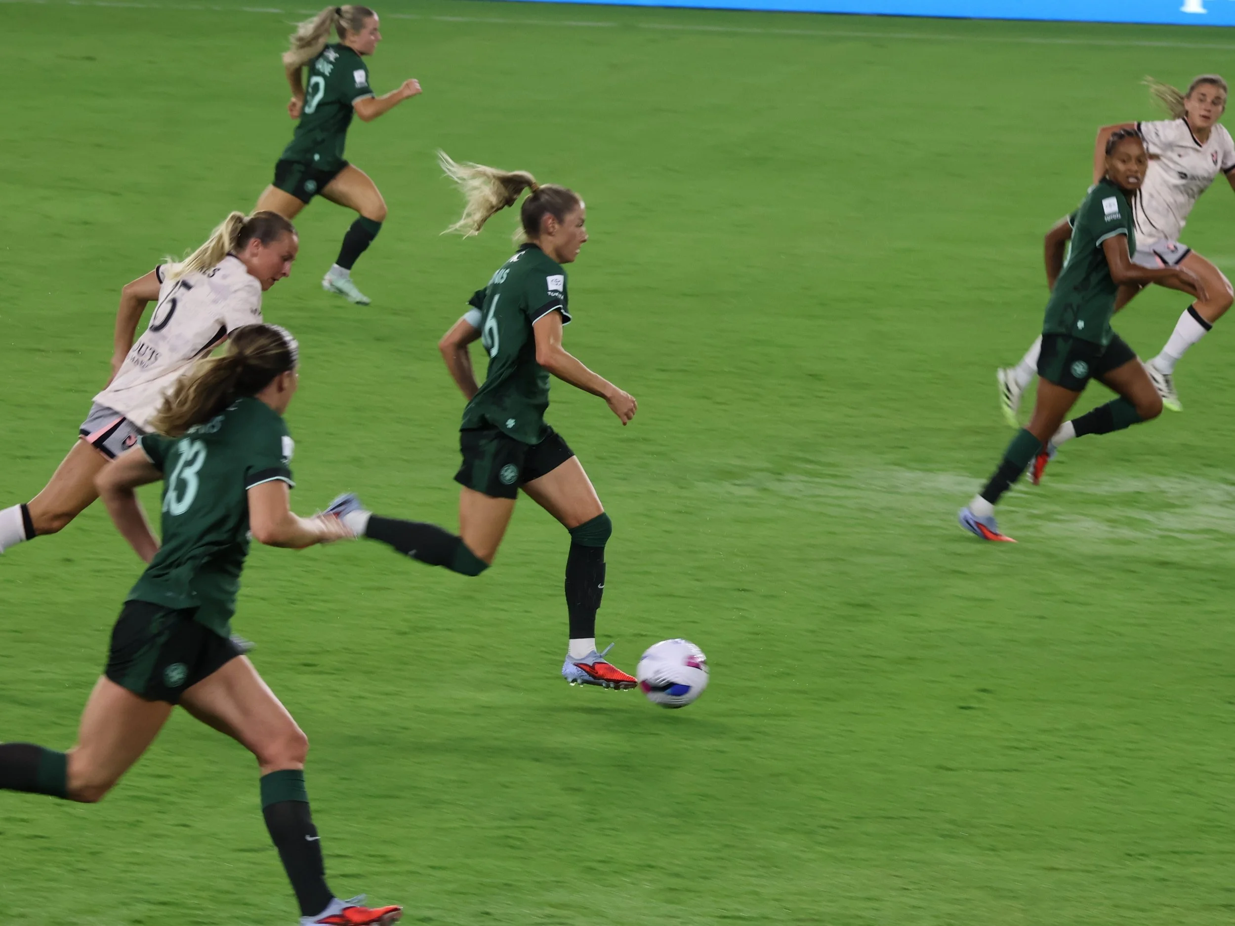Ella Hase brings the ball back to Angel City’s half, maintaining control while letting 2 AC players go first so that there’s no confusion about offside, onside, or on-the-side, which is how the NWSL refs view their jobs since they are actually full-time mall cops.