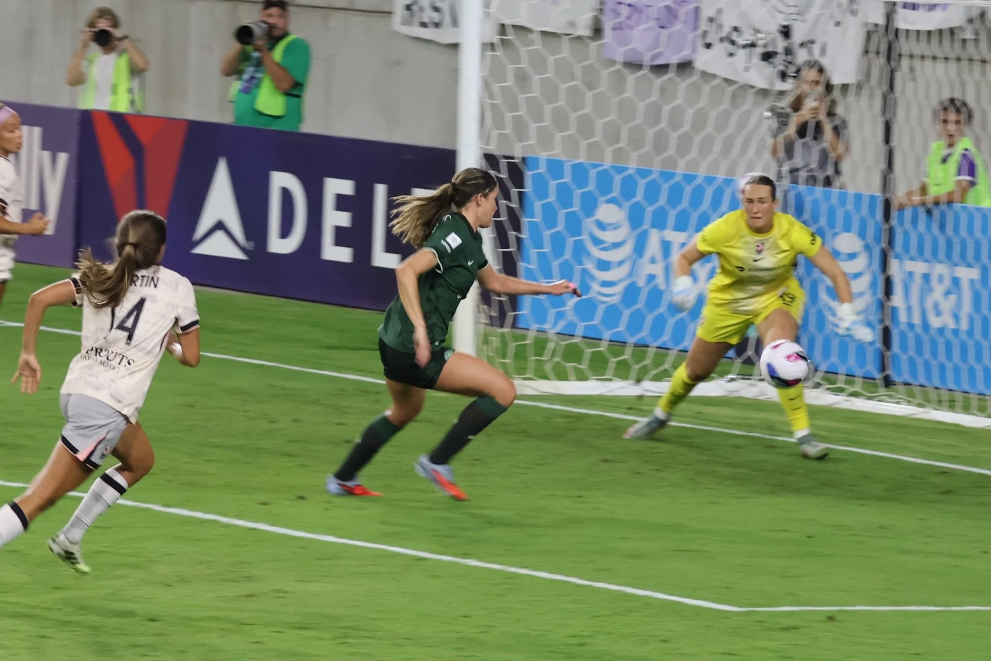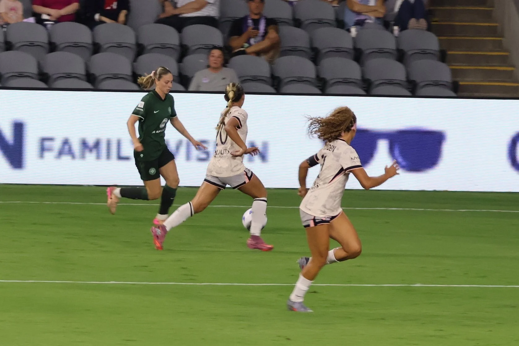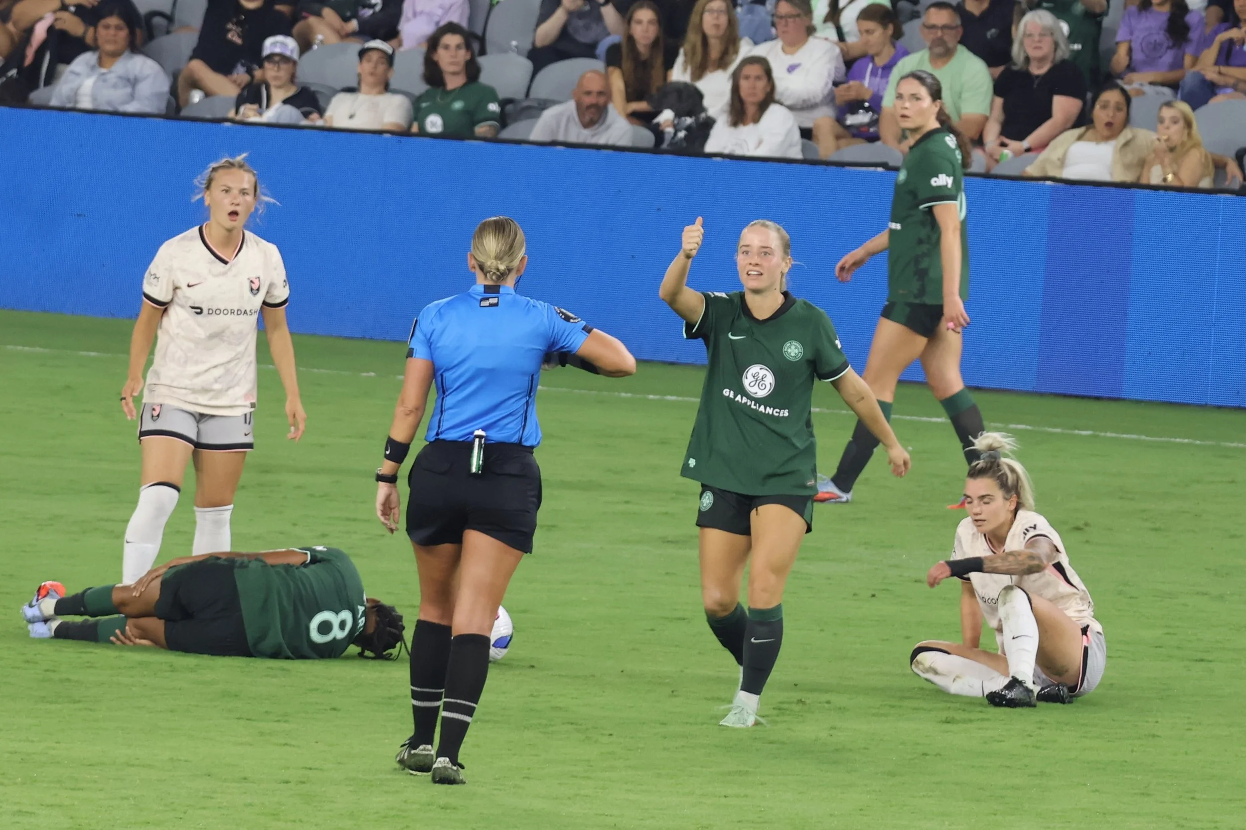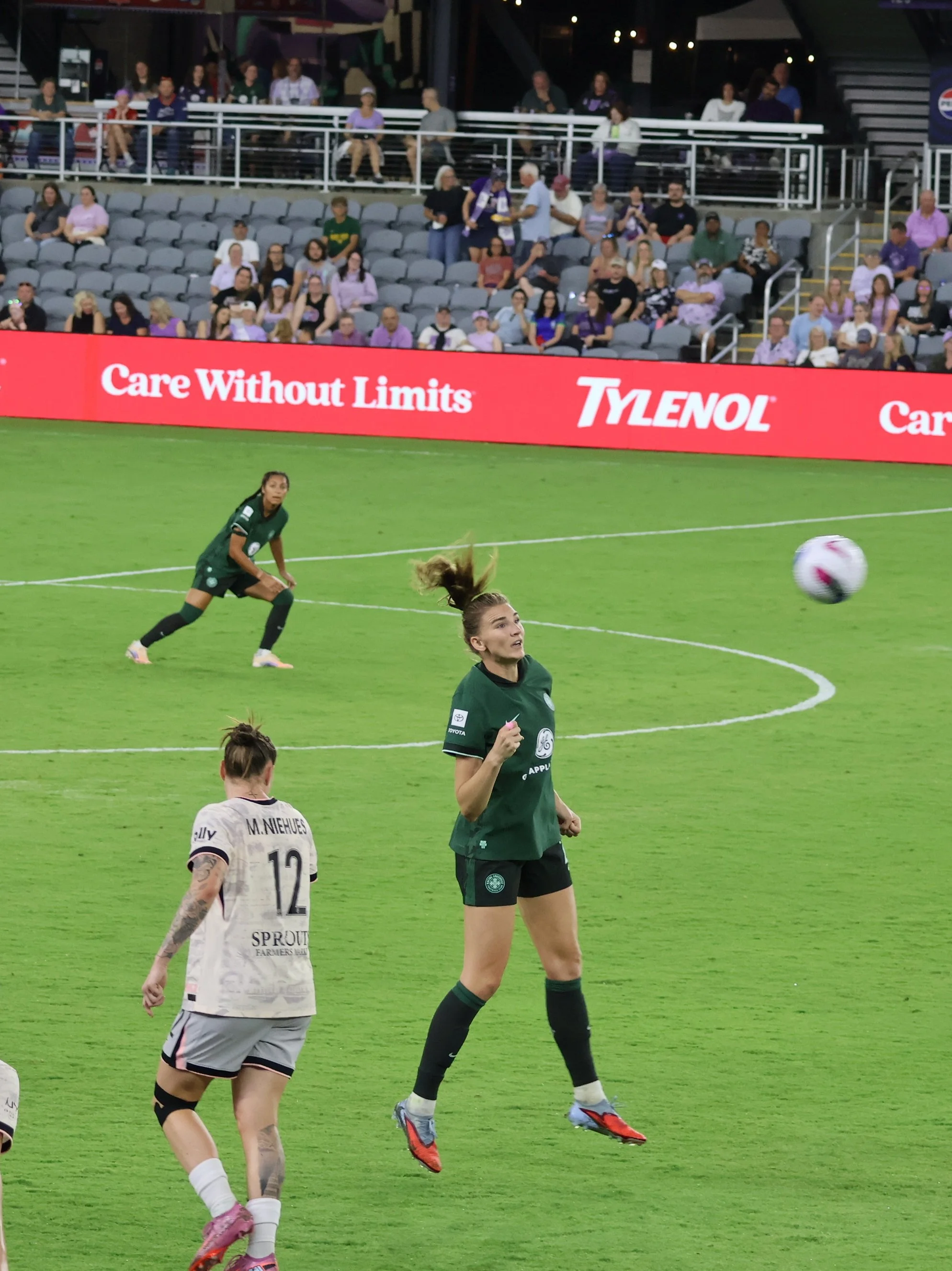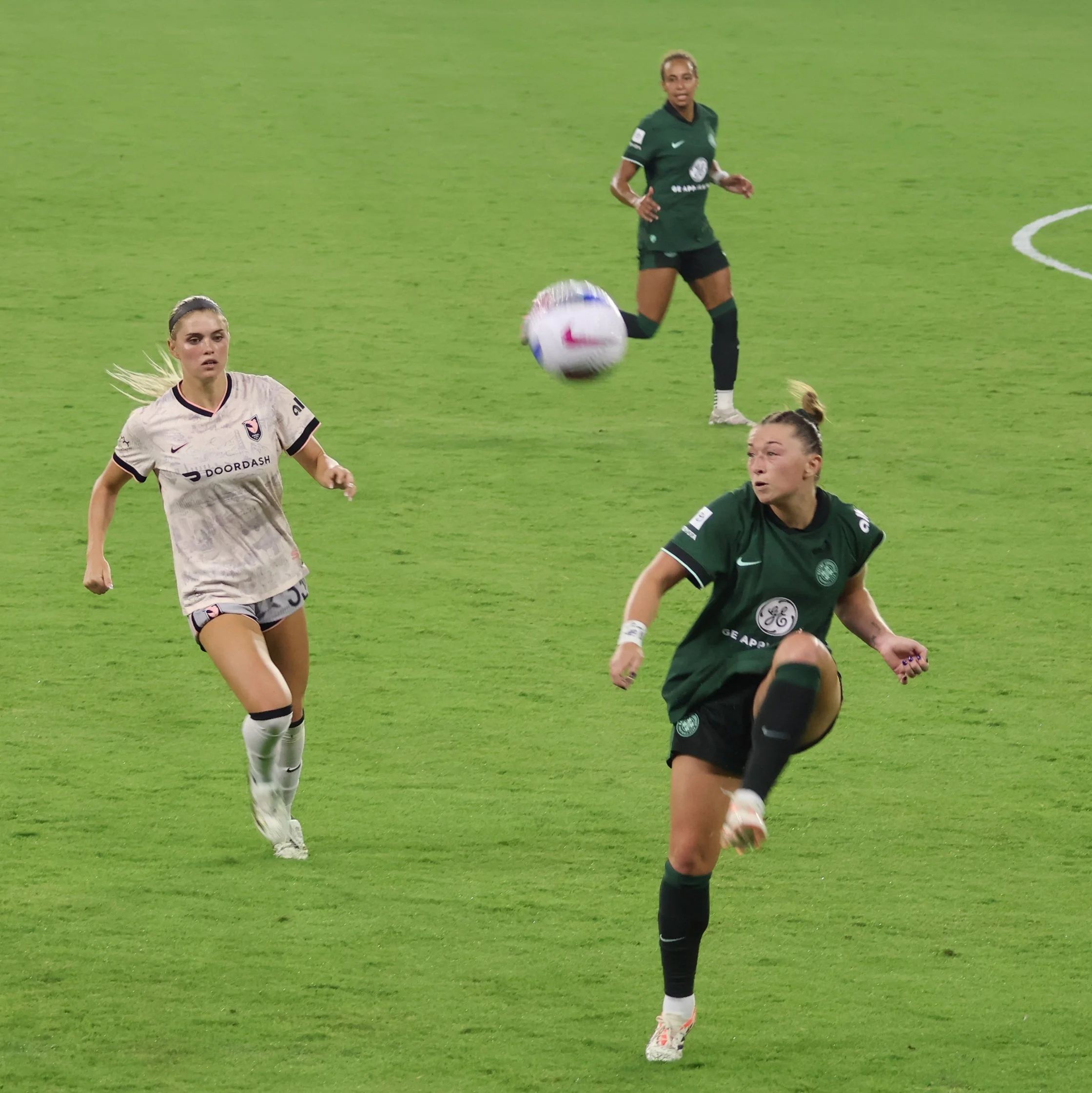 Ella Hase brings the ball back to Angel City’s half, maintaining control while letting 2 AC players go first so that there’s no confusion about offside, onside, or on-the-side, which is how the NWSL refs view their jobs since they are actually full-time mall cops.