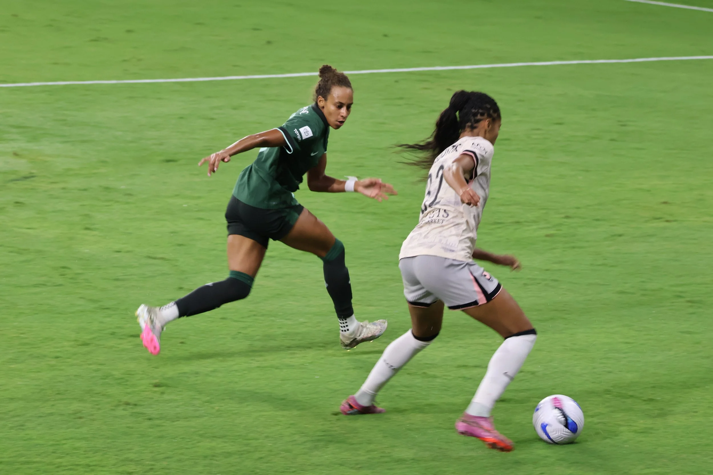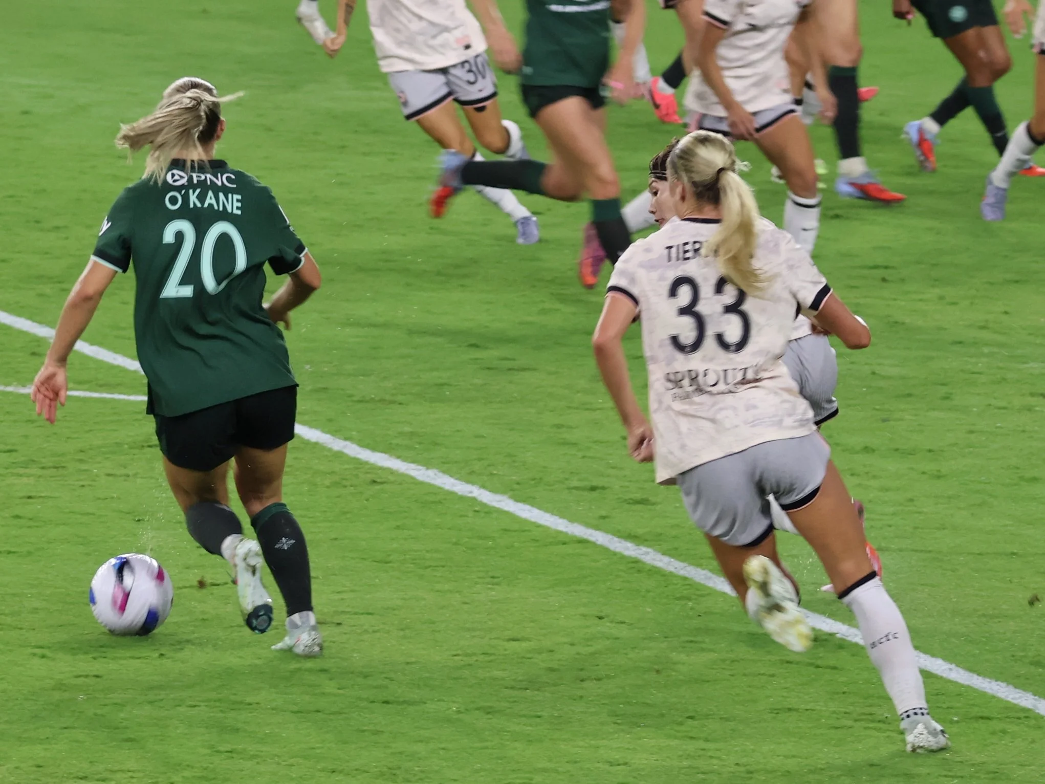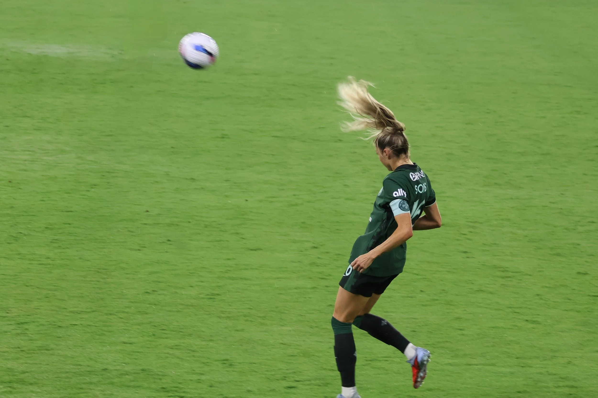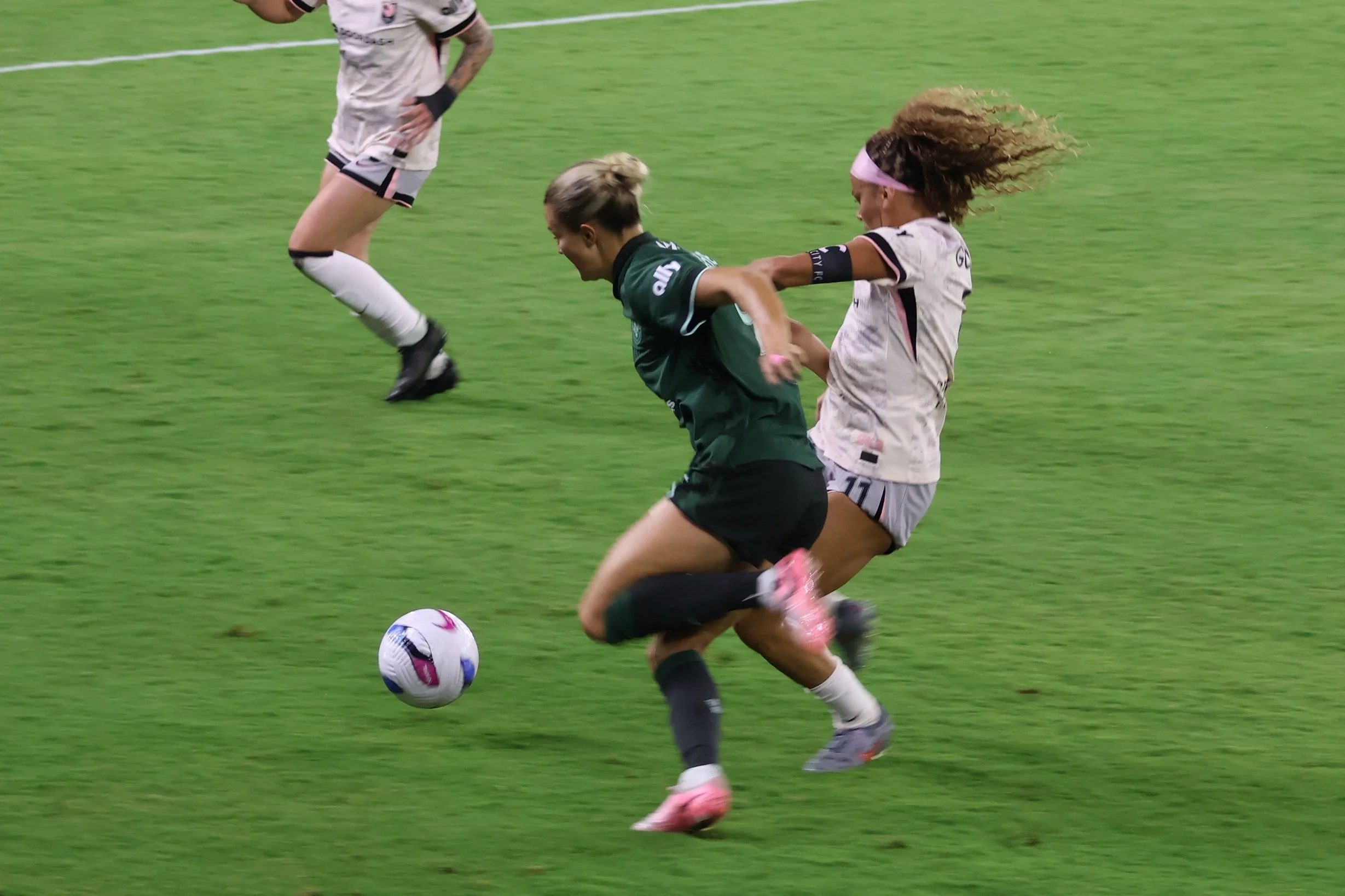 Ella Hase brings the ball back to Angel City’s half, maintaining control while letting 2 AC players go first so that there’s no confusion about offside, onside, or on-the-side, which is how the NWSL refs view their jobs since they are actually full-time mall cops.