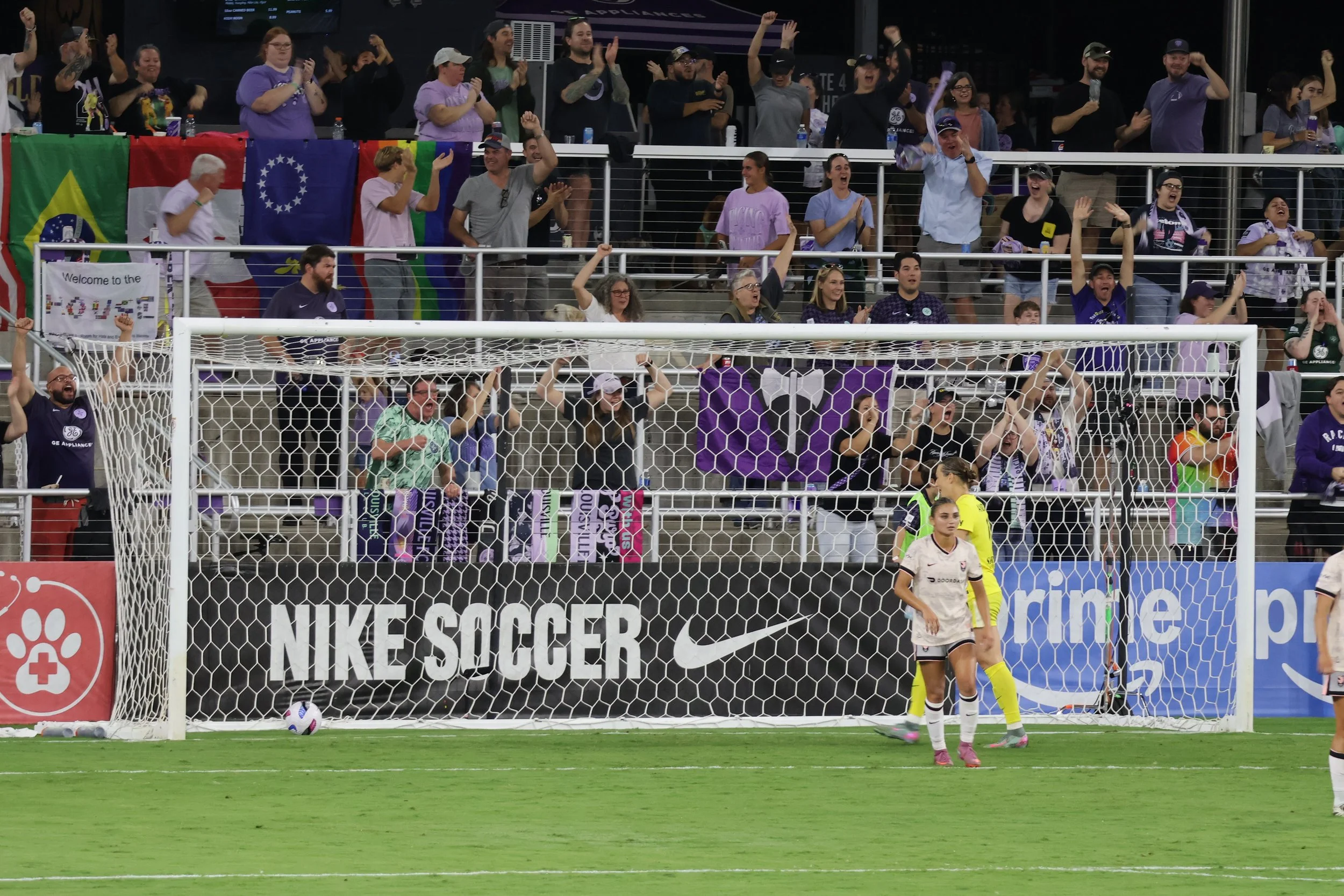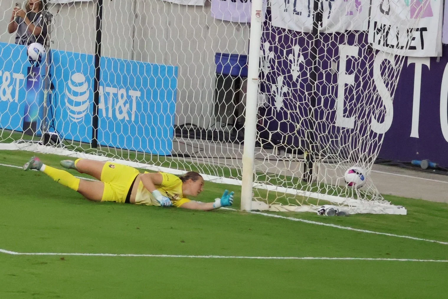 Here is Racing’s first goal, which turned out not to be a goal, because somewhere, someone was allegedly offside. It was still a fun picture of the Angel City Keeper on the ground, looking back at the ball in the net and questioning some of her life decisions.