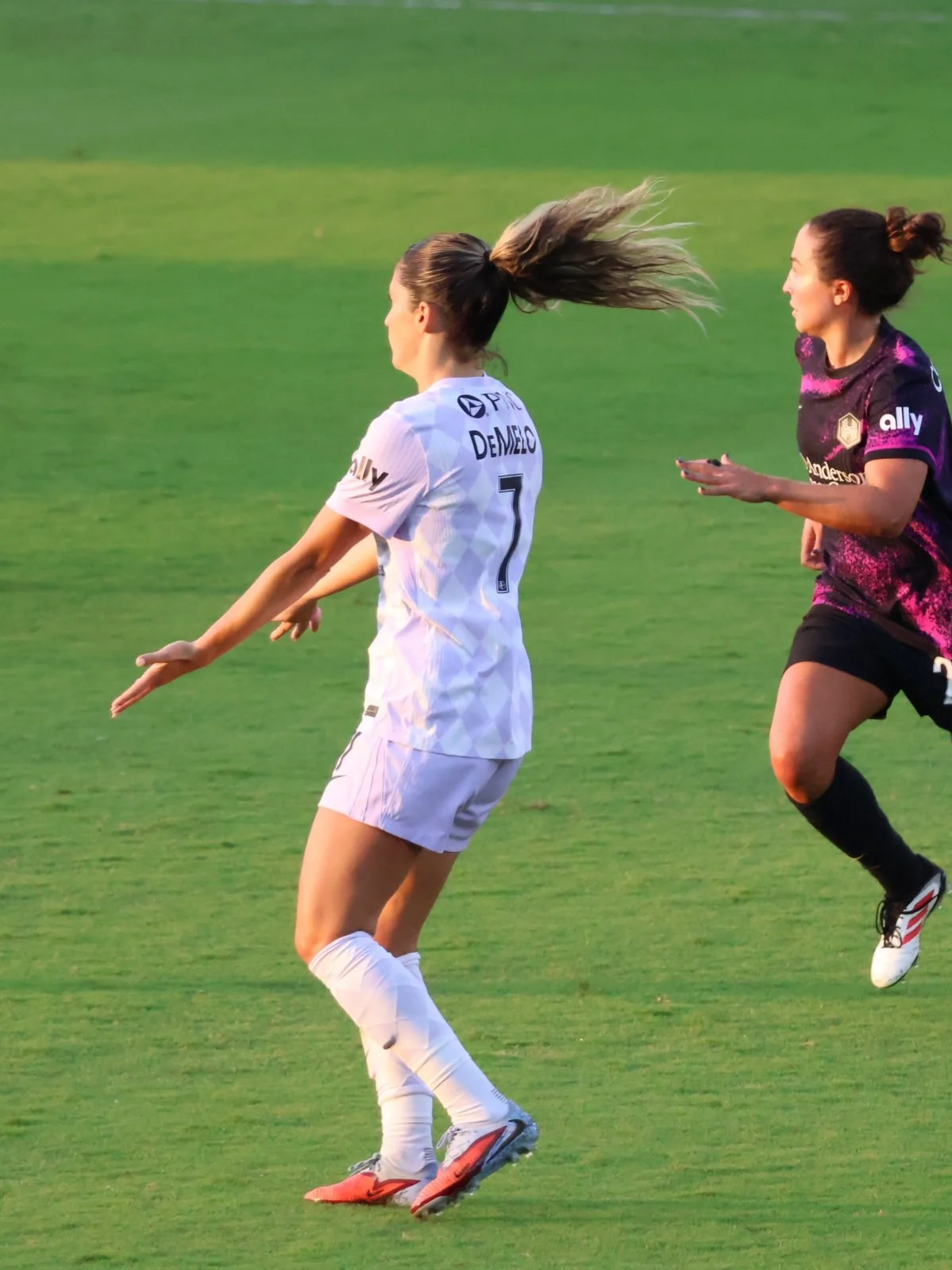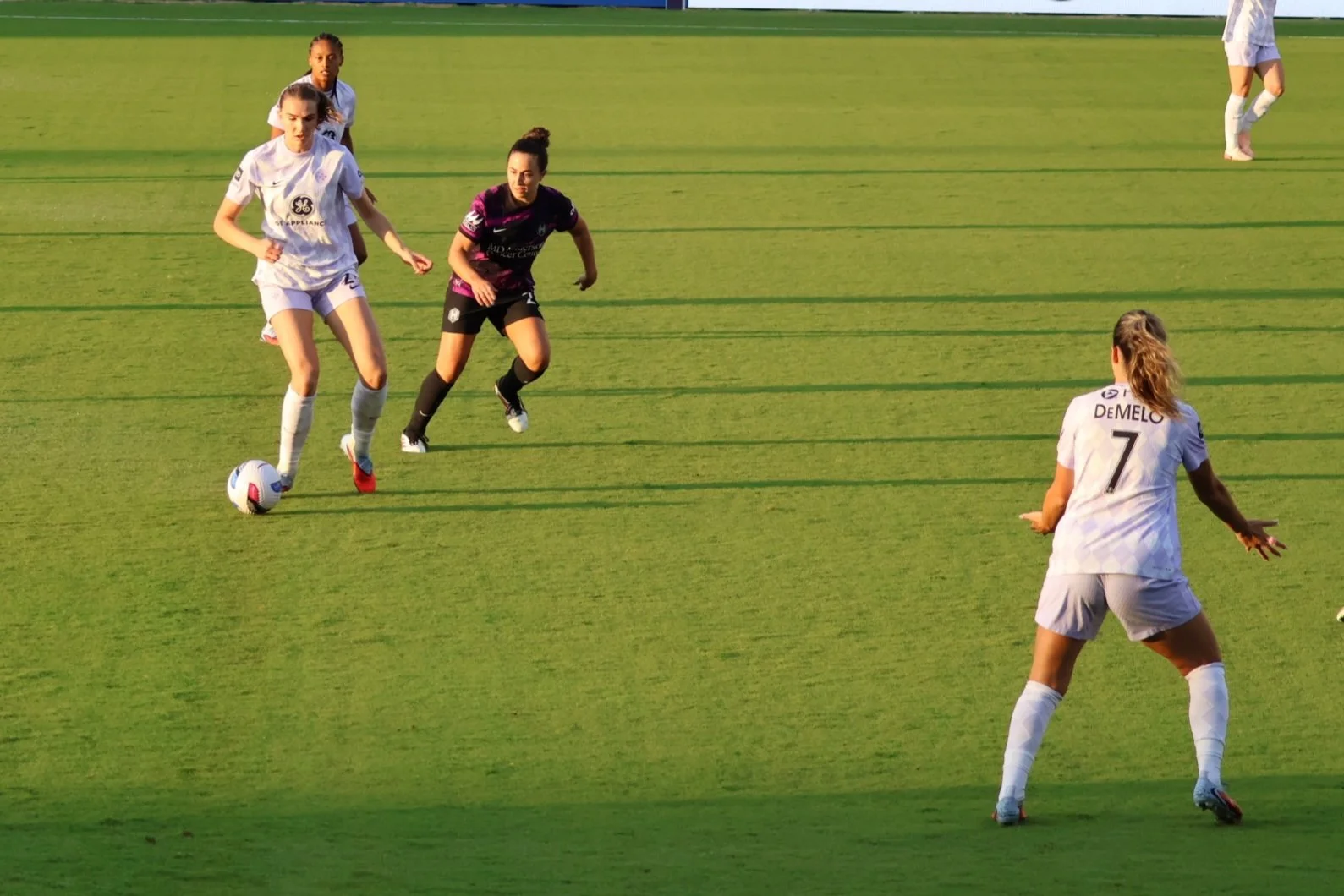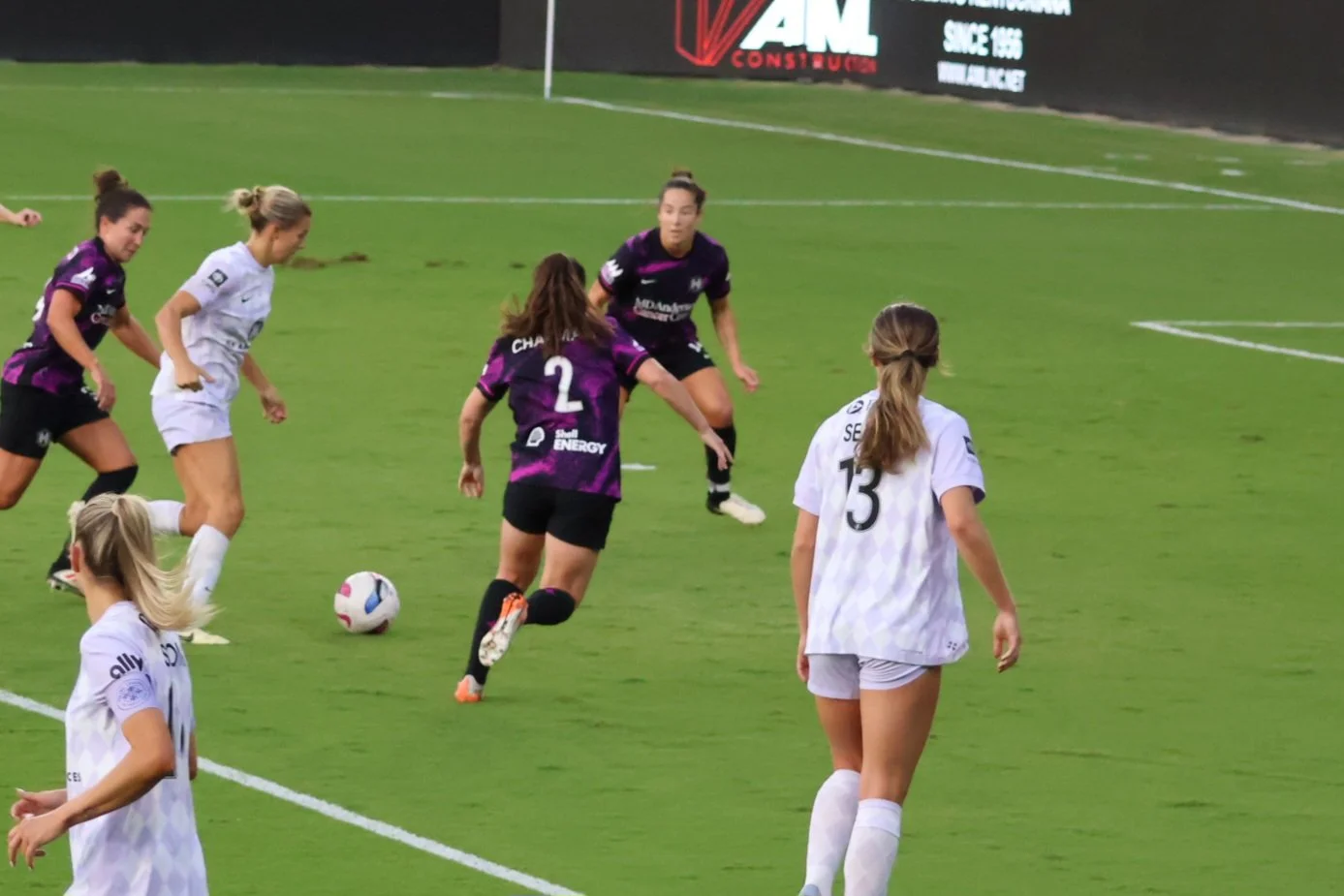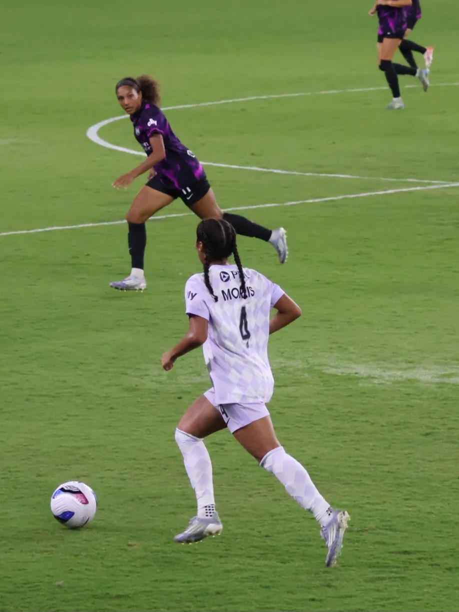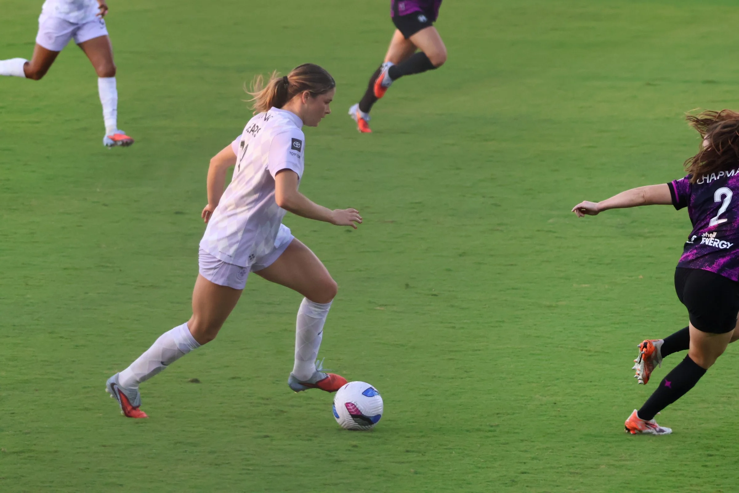 Emma Sears swiftly takes the ball down the pitch while the Dash player can’t decide if she wants to run or keep her eyes on Sears. Girl, both.