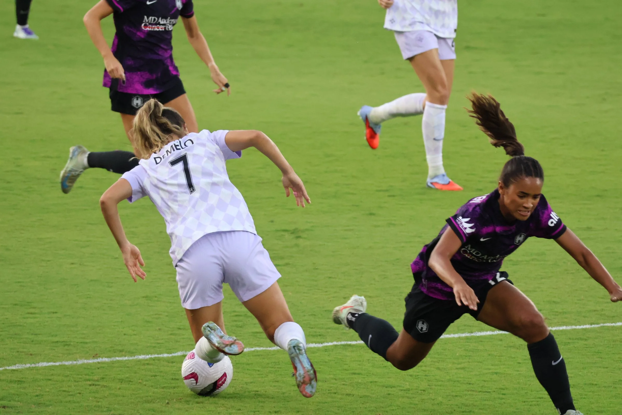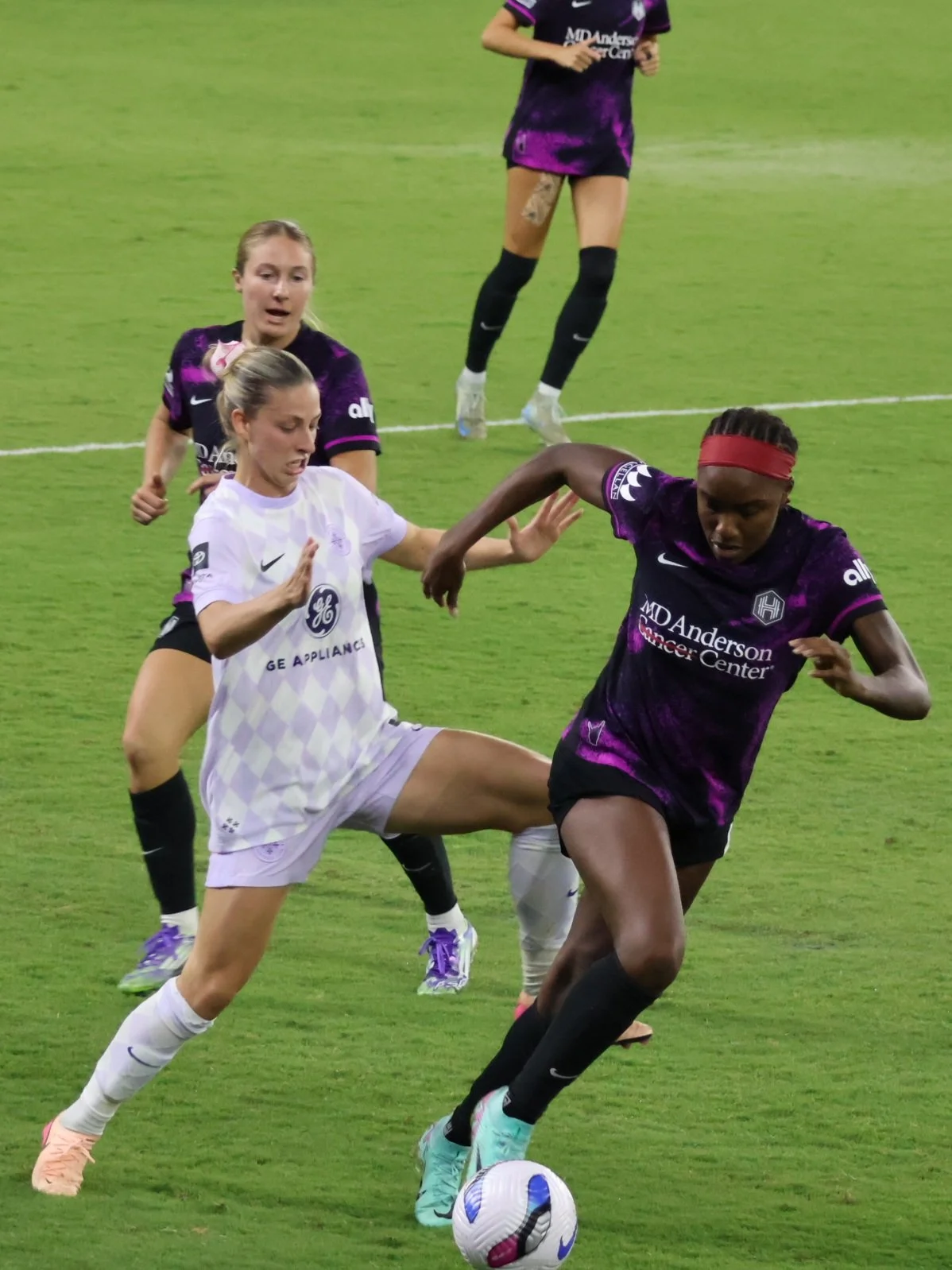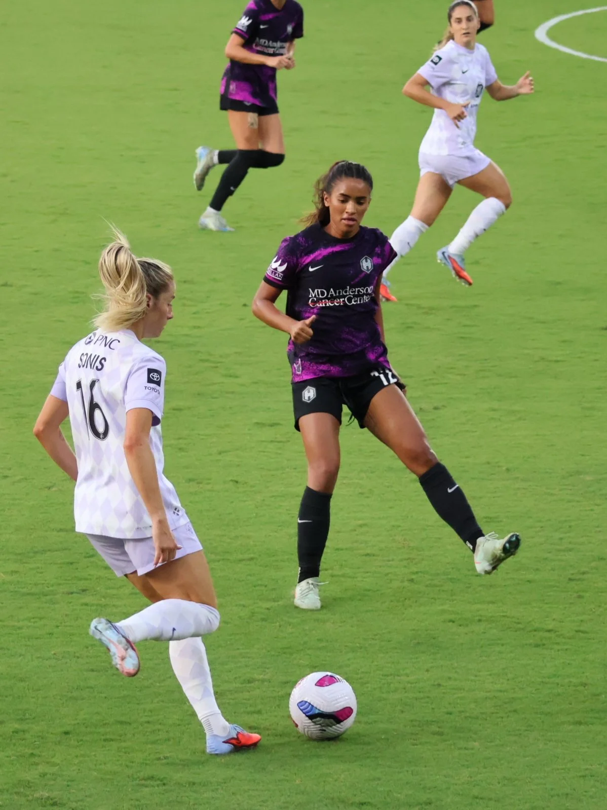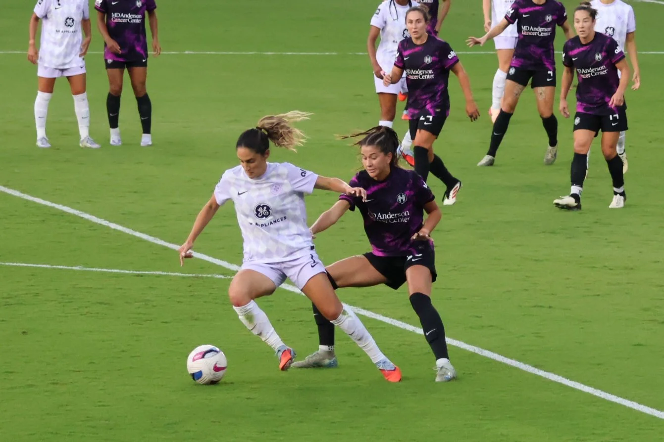 Savannah DeMelo beautifully controls the ball despite the handsy Houston player.