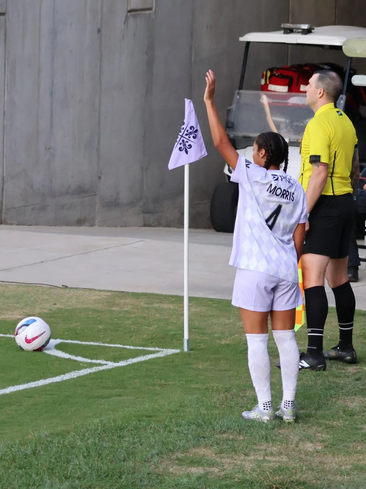 Makenna Morris takes her first corner kick as a Racing Louisville player. The ref looks like it’s his first corner kick, too. Not that he’s young.
