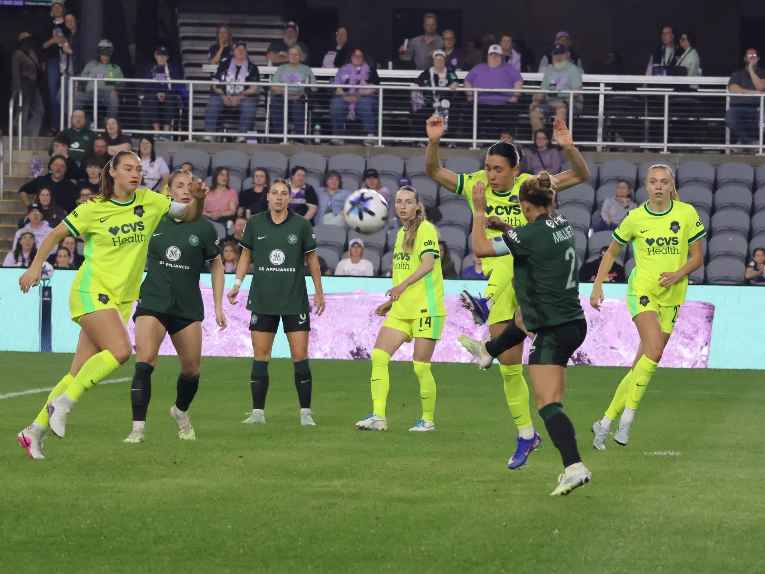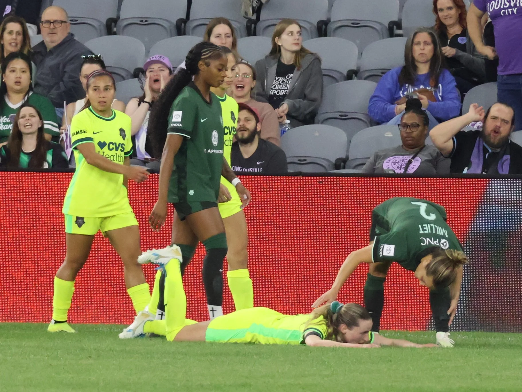 The Spirit players are ready to concede the match early as they good a closer look at Lo Milliet’s kicking prowess.