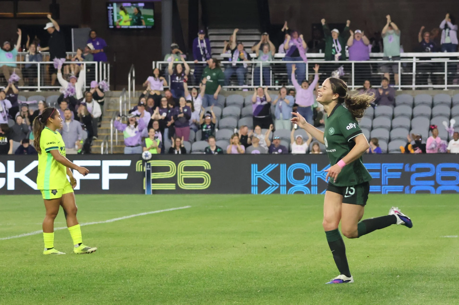Emma Sears celebrates her goal that gave Racing a 2-0 lead over the Spirit.